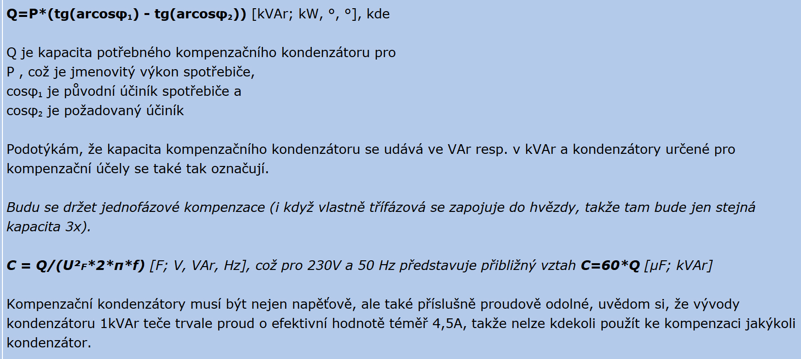 Stejně bych změřil účiník a zkusil ho u mrazáku kompenzovat paralelním připojením kapacity vhodné velikosti. Tady ta kapacita vyjde malá - ono je taky rozdíl, jestli se má kompenzovat rozvod distributora s jeho megawatty, nebo výstup měniče 2 kW. Výpočet je třeba na http://www.ebastlirna.cz/modules.php?na ... ic&t=66217 - viz obrázek