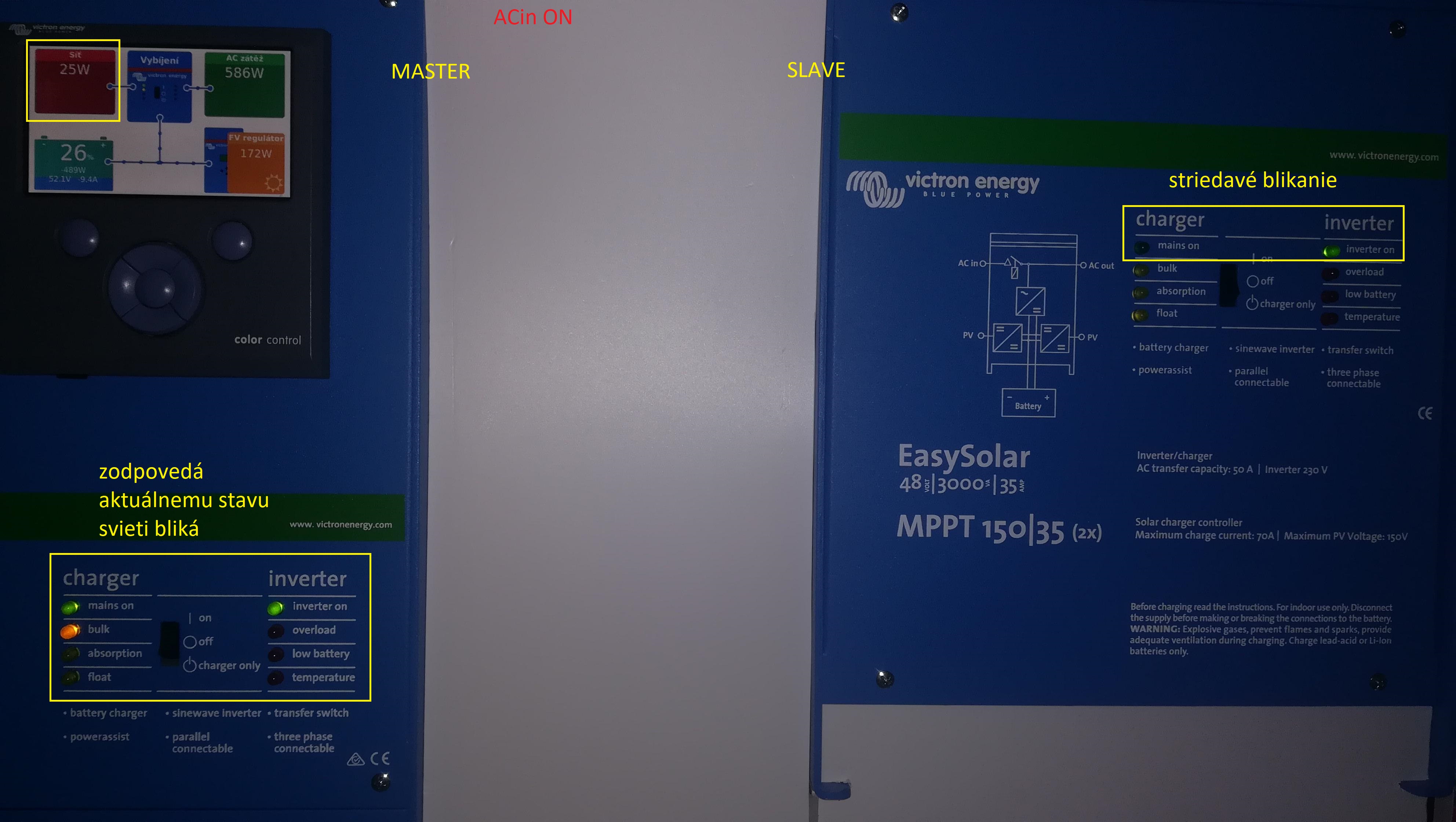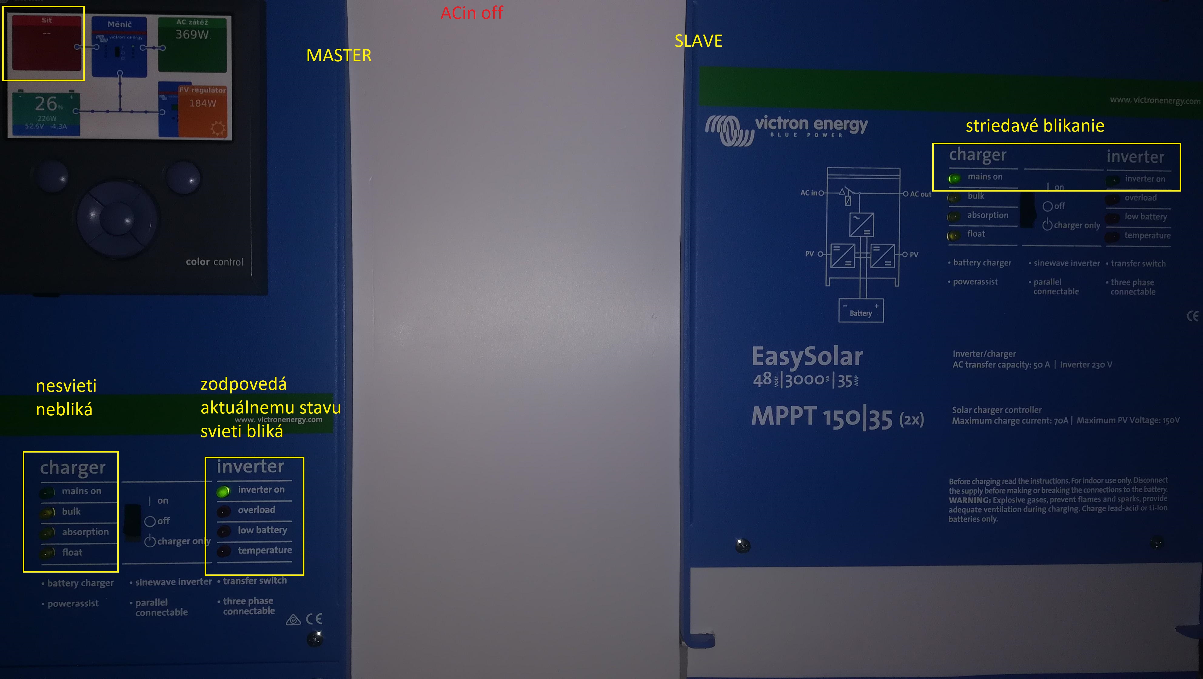 Před konfigurací ESS se přes VE Bus System configurator toto paralelní spojení dvou takto blikajících easysolarů nakonfigurovalo jako 1AC a 1 fáze a jsou na Line In a Line Out paralelně propojený?