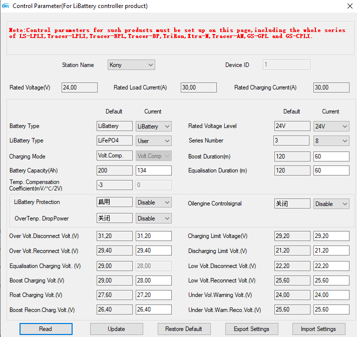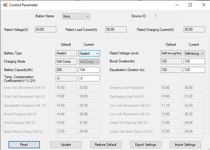 2, BOOST: 28.4 V , FLOAT: 27.4 V. LVCutoff: 23.2
