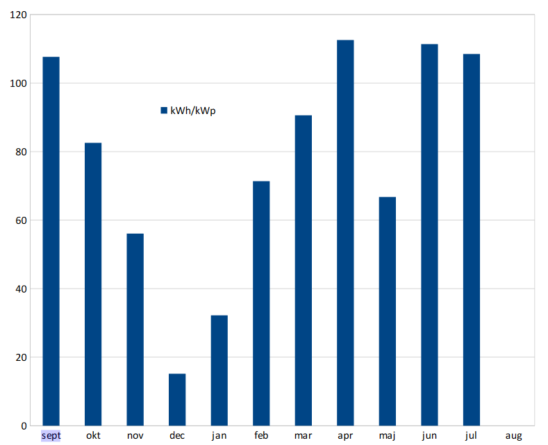 Rok ubehol akosi rýchlo, môžem uzavrieť štatistiku. Nie je celkom presná, lebo v máji, júni a v auguste bolo neznámo koľko dní, keď som opúšťal domácnosť a prebytky nebolo kam dať... Takže súčet energie získanej za rok z 1 kWp za regulátorom je 947 kWh bez spomenutých nevyužitých prebytkov.