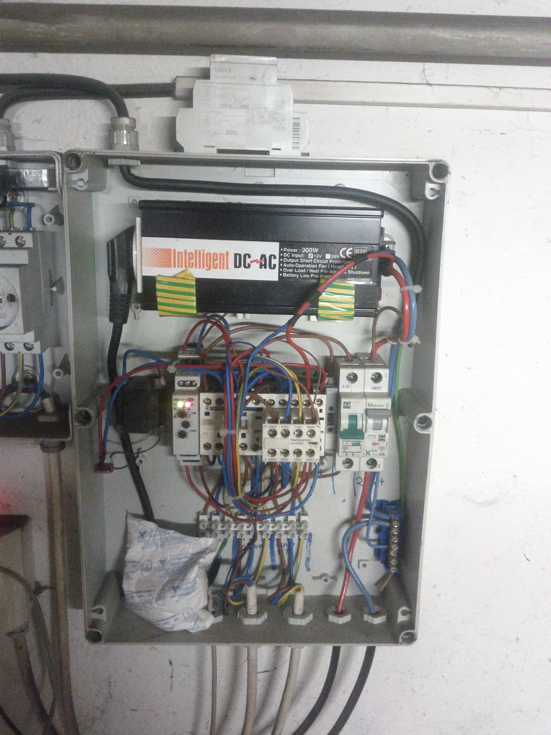 Ovládanie napetie AC z meniča cez prepínacie relé privádza napetie z DS podla potreby priority .Nevýhoda bola ak by vypadla DS tak by nič nešlo.Teraz by som to riešil asi arduinom ale menič Victron je hybrid tak mi už prepínanie sietí nie je potrebné.