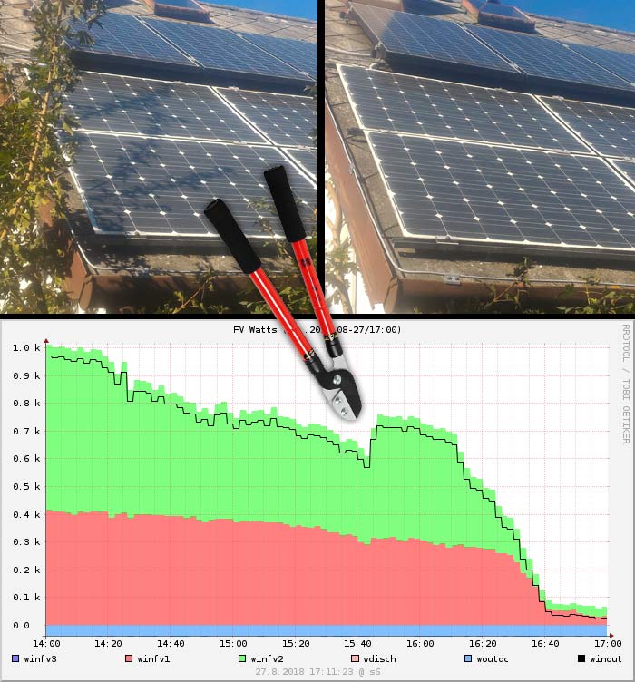 Zdravím, podle mých bohatých zkušeností se stíny nevadí částečné zastínění panelů, které jsou zapojeny paralelně - zbytek dodává svůj maximální výkon podle úhlu světla a teploty. U série ovšem dojde k poklesu výkonu celé té série i částečným zastíněním jediného panelu. Takže panely je potřebné zapojit tak, aby nedocházelo k situaci, kdy jsou současně zastíněny některé panely všech paralelních větví, jak píše Kybos.