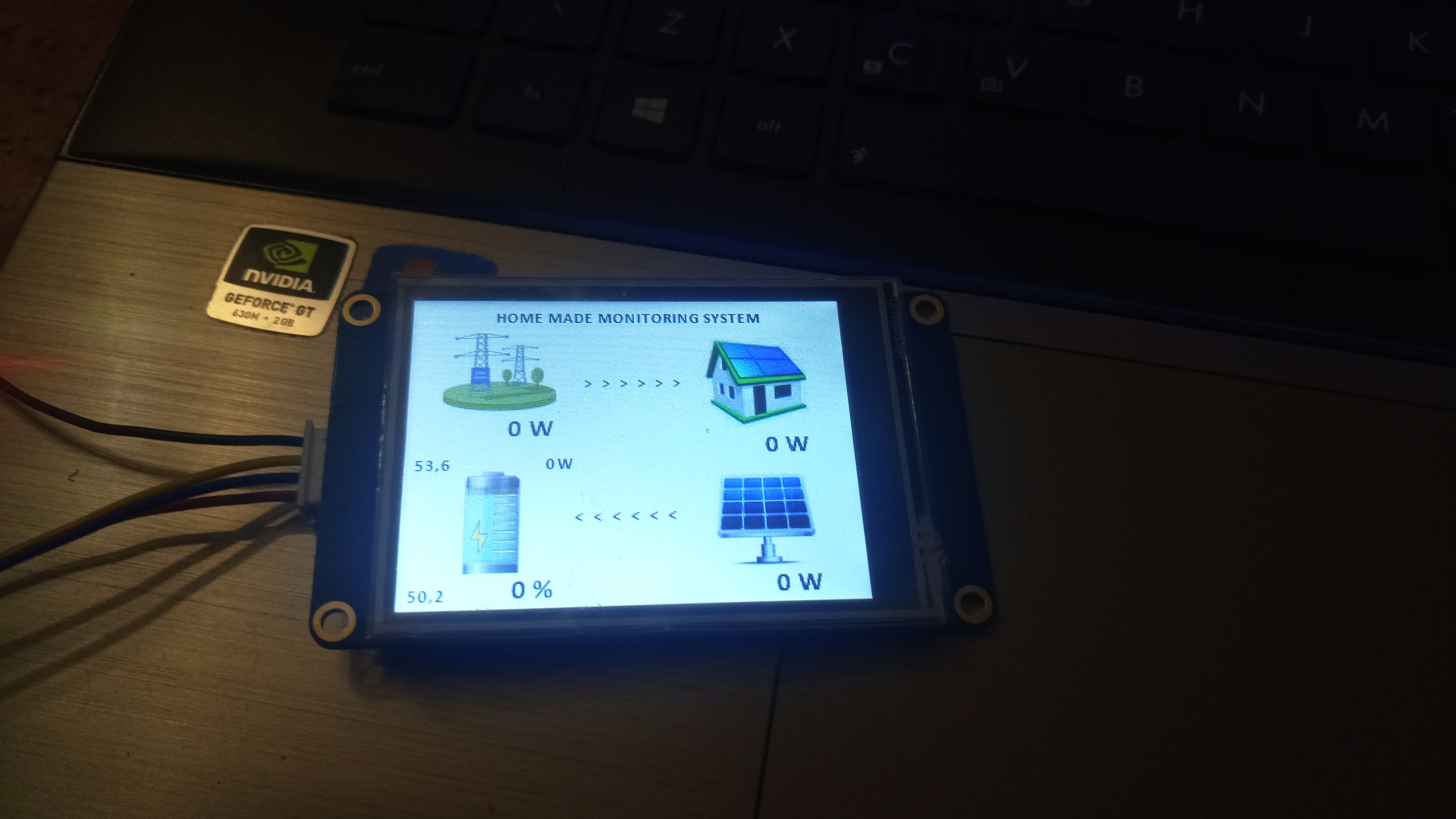 a jinak si hraju, programuji si displeyík na to observovadlo co si delam k elektrarne, tuna je zakladni vzhled. melo by to jeste mit dve dalsi stranky. tam budou volty kazdeho clanku baterie.. no a ty baterie mam dve, proto dalsi dve stranky.