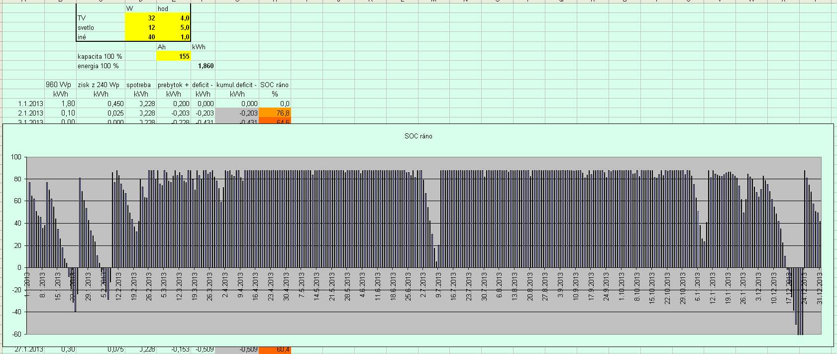 Zapovedal som sa, že do tohto debatného spolku už nevstúpim, ale keď si uvedomím, že to všetko je pre pani mámu ( ako to bolo upresnené ), dávam všetko nepodstatné bokom a pokračujem. Ako vidíte hore, nikto nedal konkrétnejší návrh, ako ja. Nepodsúval by som pani mámě žiadny petrolej, jakožto vec smrďatú a horľavú, nenabádal by som ju vláčiť domov obstarožné batérie na dobitie, ale by som jej radšej spríjemnil život na chate, vzdorujúc vždy prítomným blbinám, tu a všade vezdejším. Nič nie je argumentačne silnejšie, ako skúsenosť opretá o jestvujúce fakty a výpočet. Predkladám na fórum xls súbor ku kontrole ( nie som neomylný, rád sa k chybe doznám ), v ktorom je zachytený zisk energie v mojich podmienkach, prepočítaný na 240 Wp, teda jednu štvrtinu. Zásadný údaj je ten, že ide o hodnoty za elektromerom a zo spotreby výlučne v AC. Odpadá tým potreba zvažovania účinnosti ukladania energie a účinnosti meniča. Naopak, situácia sa vylepšuje oproti skutočnosti, ak je aspoň časť spotreby v DC. Pani Romanu ale zaujíma určite jasná reč, o ktorú sa pokúsim. Ak by ste vo Vašej chate ( v roku 2013 ) denne po súmraku sledovali 4 hodiny LCD HDTV s príkonom 32 W, svietili 5 hodín LED svietidlami o výkone 12 W a používali hodinu ďalší spotrebič s príkonom 40 W, Vaša batéria by bola zaťažovaná takto :