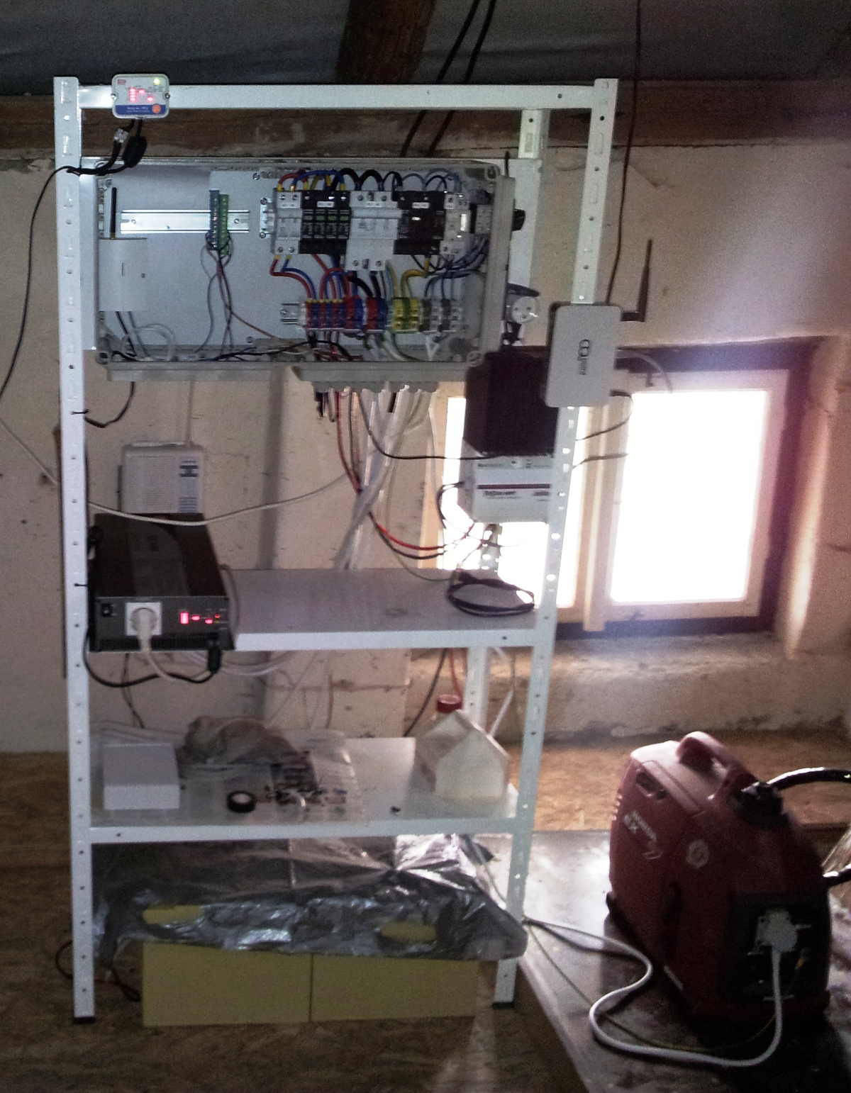 Funguje bez problémů a na první zapojení. Funkce Standby je ale při využití v ostrovním systému k ničemu. Svodový proud/odpor vedení po domě a elektroinstalace je dostatečný na to, aby to měnič vyhodnotil jako připojený spotřebič a do režimu Standby vůbec nepřejde. Dokonce tomu stačí rozvaděč na obrázku. Pokud přepnu hlavní přepínač zdroje na "generátor", tak vedení od měniče končí na tomto přepínači a měnič to stejně nepozná a běží dále. Mě se to povedlo teprve když jsem fyzicky vytáhnul zásuvku kterou je měnič zapojen do rozvodů. Možná nějaké nastavení uvnitř, ale to jsem zatím nezkoušel. Použitelné je tedy jen vypínání vypínačem na čelním panelu... nebo dálkovým ovládáním.