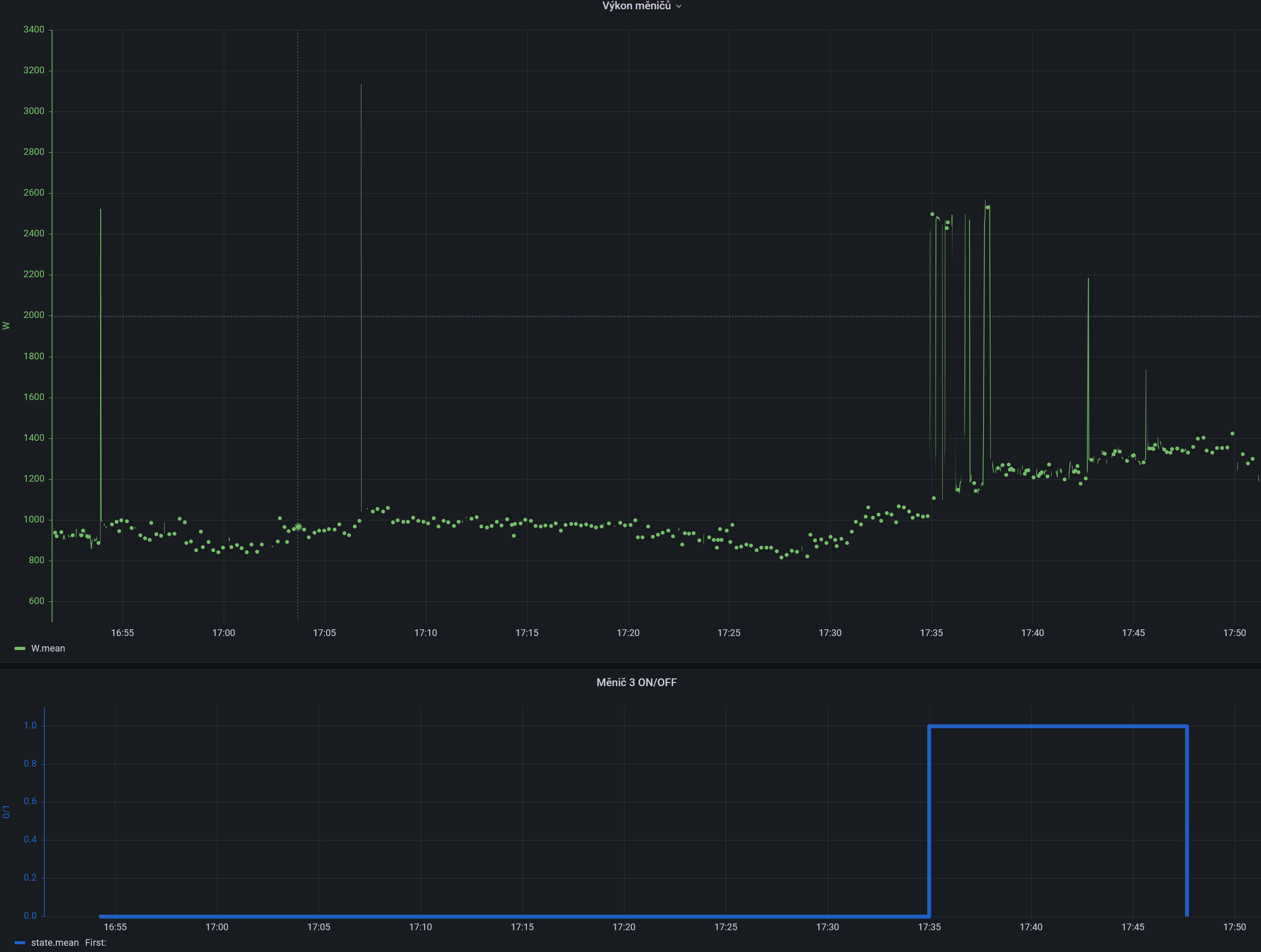 Výsledek pak může vypadat nějak takto - spínací hranice je nastavena na 2000 W, ale na některé píky systém nereaguje a další měnič nezapne. Zapne až při delším překročení meze v 17:35:
