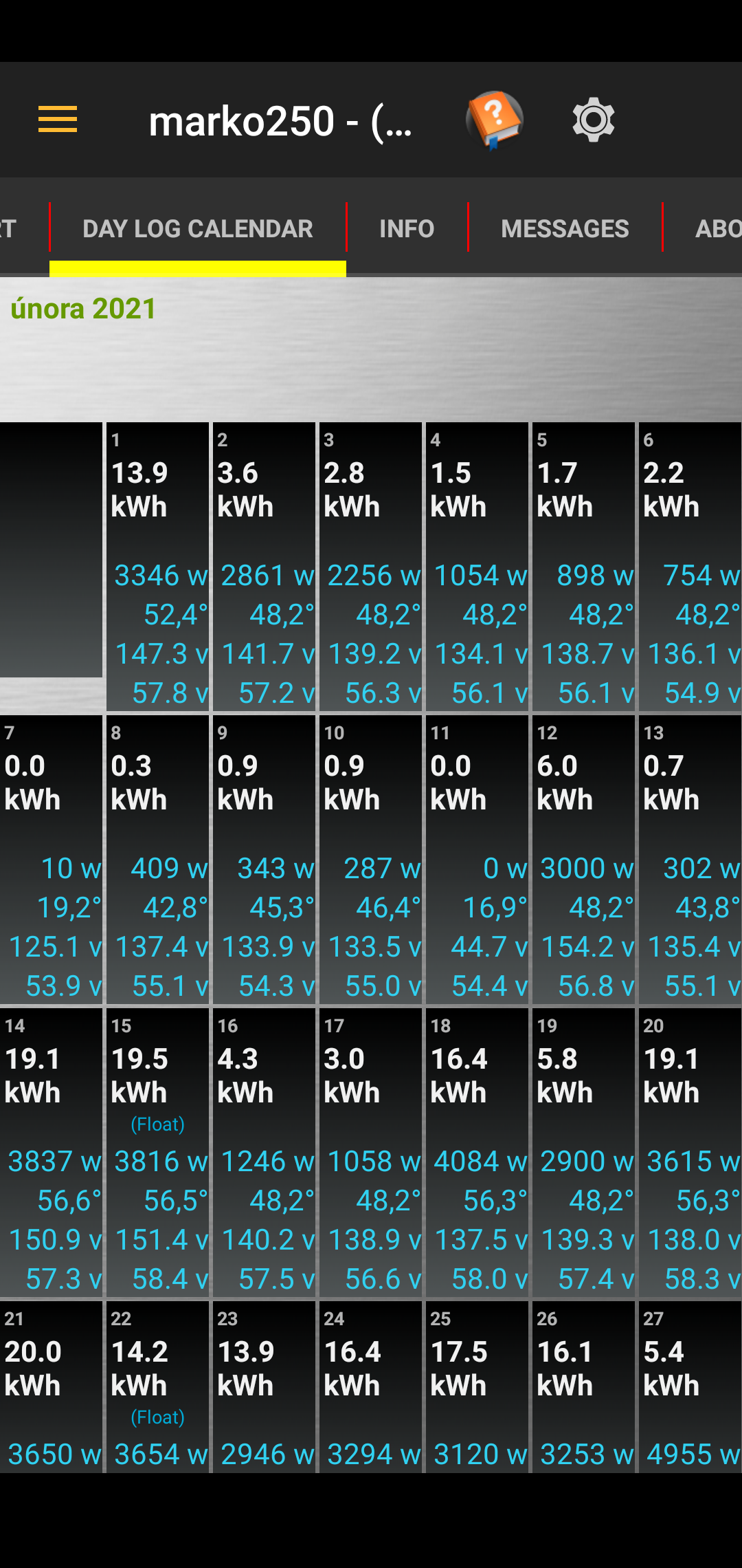 Tak únor od 11.2.2021 stále za své,za měničem je 22.381MWh ,na únor připadá tedy 381kWh+34kWh z DS.MOnitoring JZ střechy zde: