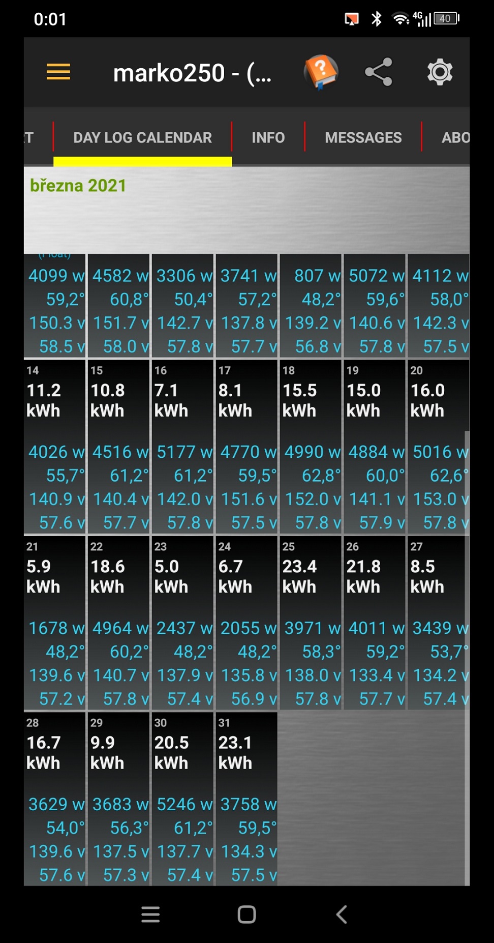 Přitápění za pomocí"klim",které jedou nyní nonstop pomáhá s vytěžováním.Každou půlnoc se mi resetuje na Studeru záznam dne a tak jsem vysledoval jejich spotřebu přez noc do rána ,kdy jdu do práce.Průměrně tam je za měničem spotřeba AC od půlnoci do 7:00hod rána kolem 2.4kWh a s tím přitápěním tam naskočí o 3.4kWh více.