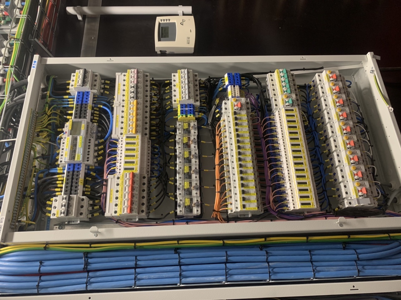 Na fotce rozvaděč pro vytěžování z FVE a kompletní elektro pro jezírko a venkovní technologie (nebudu teď zmiňovat, že venkovní technologie mají ještě druhý rozvaděč).