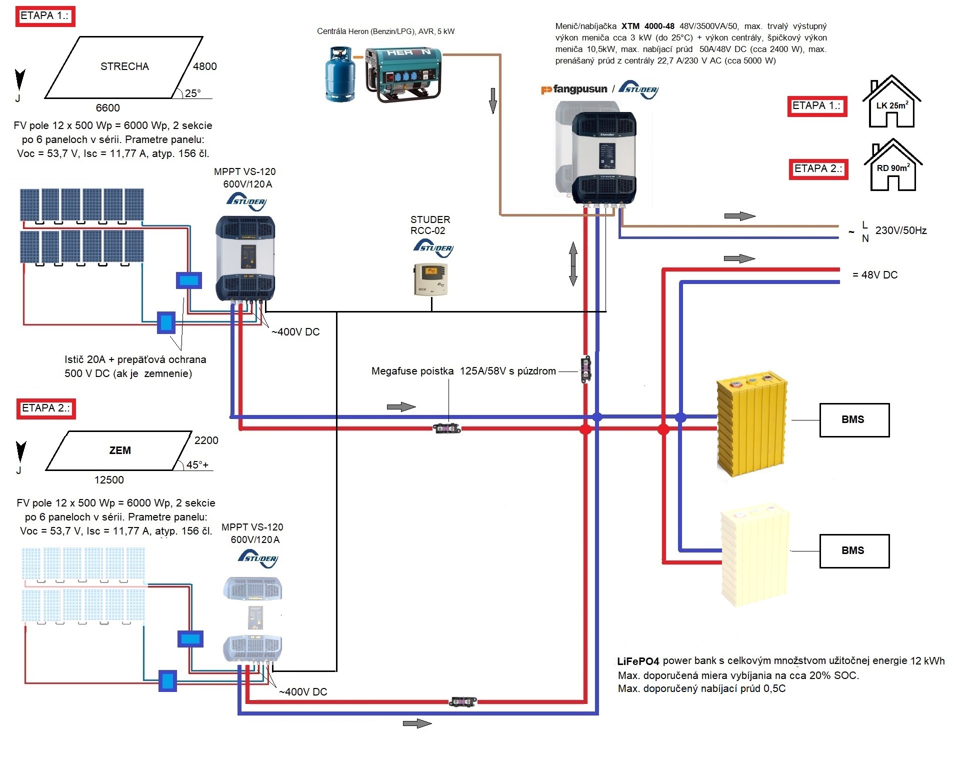 - Panely zatial len orientacne uvazujem o 500W verzii, ale ten celkovy vykon 6kWp (na etapu) prakticky moze ostat