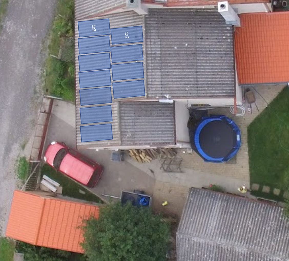 - k dispozici střecha na cca 11 panelů, sklon 15, orientace 160°(20°východně od jihu), absolutně bez stínů. Pak další střecha na garáži a zahradním altánu - ale ty jsou víceméně stíněné budovami a stromy