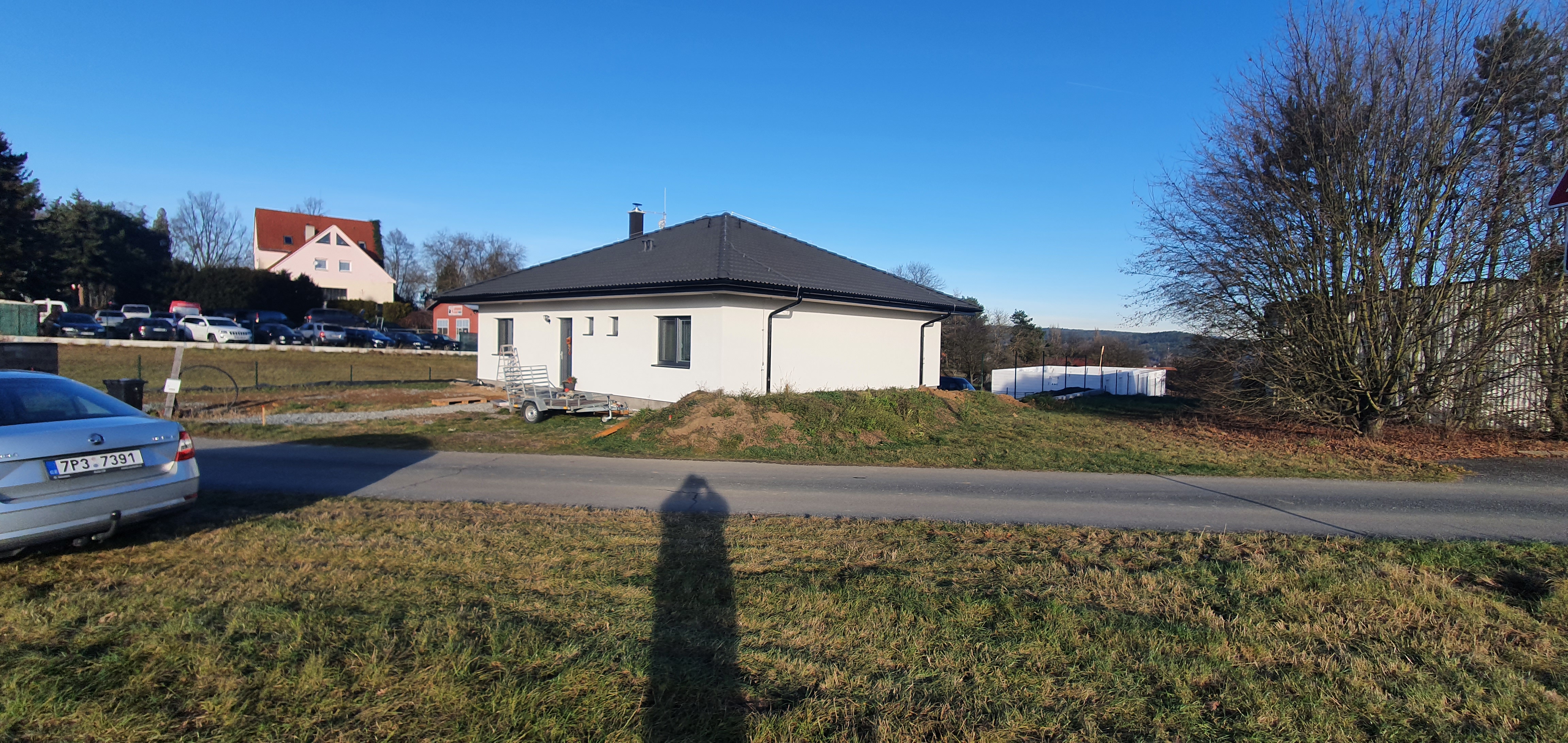Sice jsem si barák stavěl svépomocně, ale střechu a zateplenou fasádu ne, nemám rád výšky (máme bungalow ve svahu, na straně dole jsme nějakých 6m k hraně podbití střechy) viz foto: