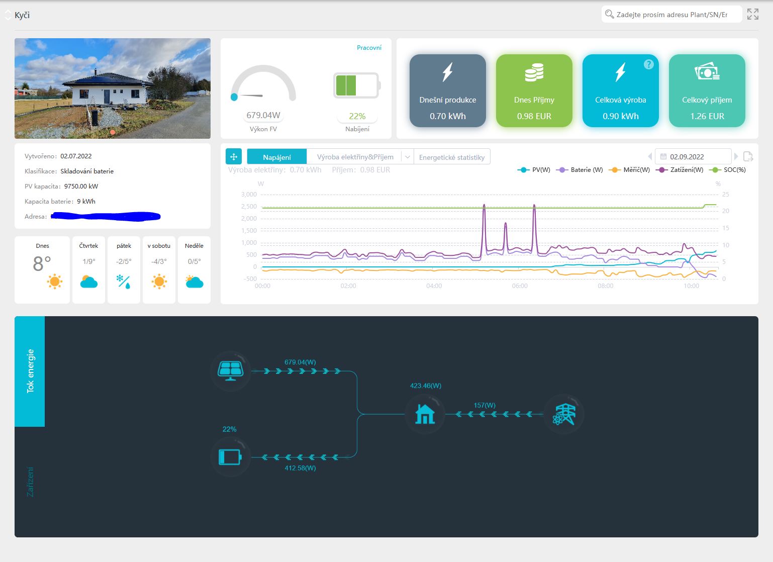 3) Být ideálně 8-9 měsíců naprosto soběstačný, proto 14.2kWh baterie a 9,6kwp na střeše.