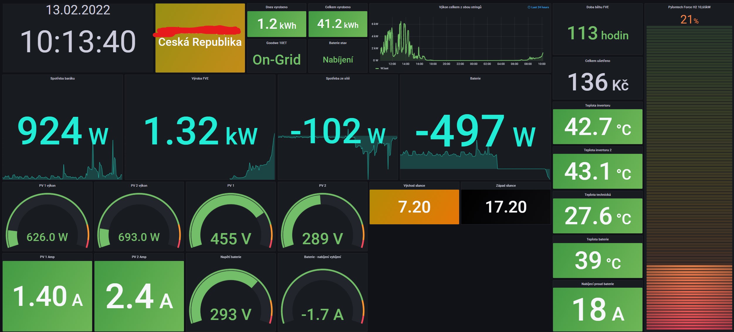 25x Trina Vertex S 390W (12x jih 13x jihozápad) - 9,75kWp, Goodwe 10 ET, 4x Pylontech H2 - 14,2kWh, IntelNUC s Homeassistentem, InfluxDB, Grafana, Fibaro HC3 atd