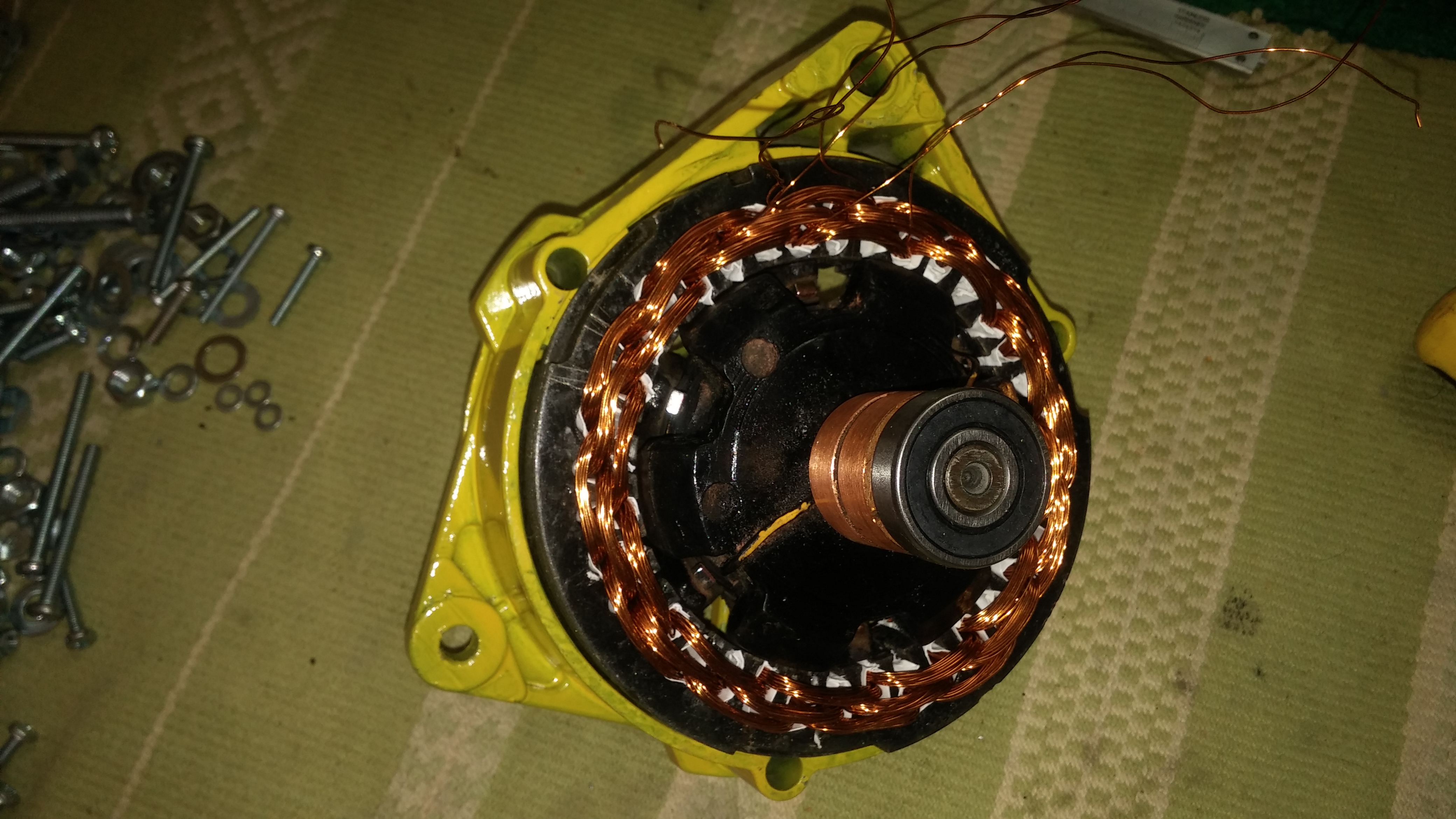 Vyvedl jsem si ze statoru každý vodič extra zvlášt. A odzkoušel každou fázi zvlášt. Tak na 100% vím, že všechny fáze "tlučou." Ty výstupy si pak vyvedu k usměrnovači a jako na 3f svorce u motoru hvězda/trojúhelník si tam připravím možnost, rychlým přepájením propojek v jednom z těch otvoru pro větrání, si případně i volit zapojení hvězda/trojúhelník. Podle fotek je to ještě jen takový rychlotest, že teda stator funguje, tak se moc nesmějte. Statorové vinutí ještě zastříknu na závěr lakem, trochu očistím od vrtsvy bavy ty pólové nástavce-lehce drhnou. Dále očistím trochu těleso altíku, v místech kde je usazeno na stator, ať taky sedí taky jak má a průchody na kostru usměrňovače-přes barvu to kostru bohužel nechytne. No chce to prostě mechanicky dotáhnout do finále a definitivně sešroubovat, místo provizorní zkoušky.