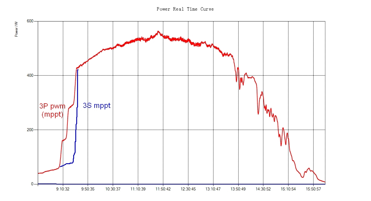 Dnes bolo pekne od rána a mal som zapnutý monitoring troch panelov 3P na pwm regulátore. Pretože graf ponúka čistú krivku, použijem ju opäť na demonštráciu výhod krátkych stringov. Už som to publikoval aj inde, ale vtedy som mal myslím k dispozícii len 2P.