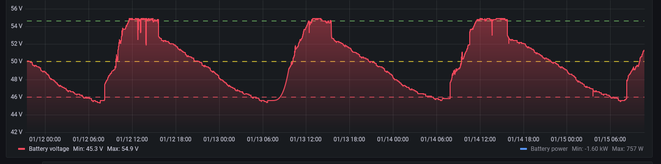 ) Mám ho v režime SOL. Ak sa ti chce, tak skús dať param 20 na povedzme 24V a sleduj kedy prepne do bypassu. Ja tam mám nastavených 44V a pozri graf kedy sa prepína...