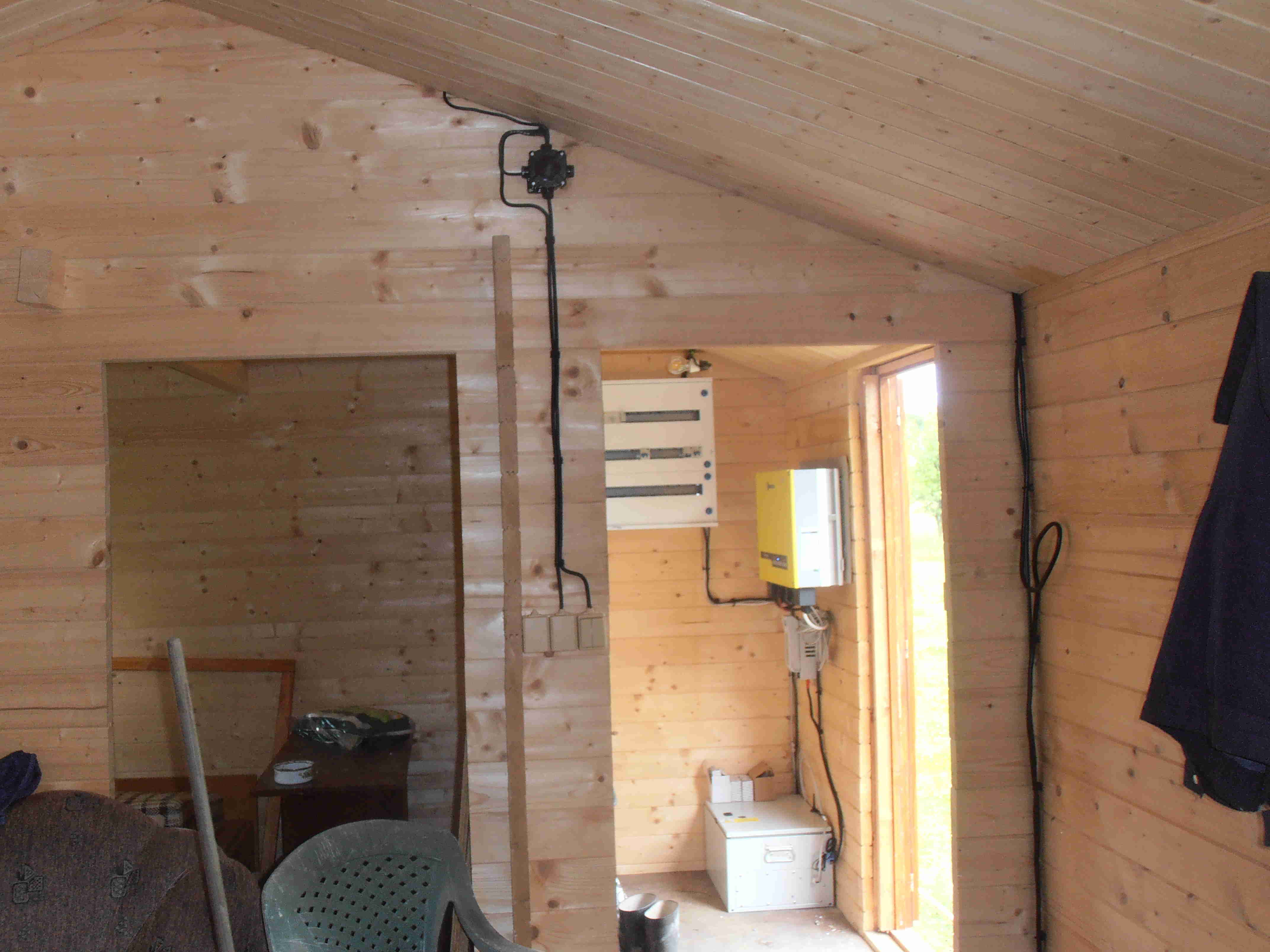 Tato 48V solární hračka napájí chatku. V ceně byla elektroinstalace osvětlení i zásuvky vše na standardních 230Vac i hromosvod a uzemnění. Dále se doinstalovali 4 sloupy se zásuvkami a s 8 kusy 50W LED refektory pro osvětlení okolních pastvin s ovcemi. Čerpadlo a rozvod vody. V chatce je TV, elektrický přímotop, zabezpečovačka, kamerový systém. Možná by na to šlo získat dotaci se zelená úsporám tuším 35 tisíc Kč pro systémy bez připojení do DS, ale tato chatka není asi zapsána v katastru a investor to nechtěl řešit.