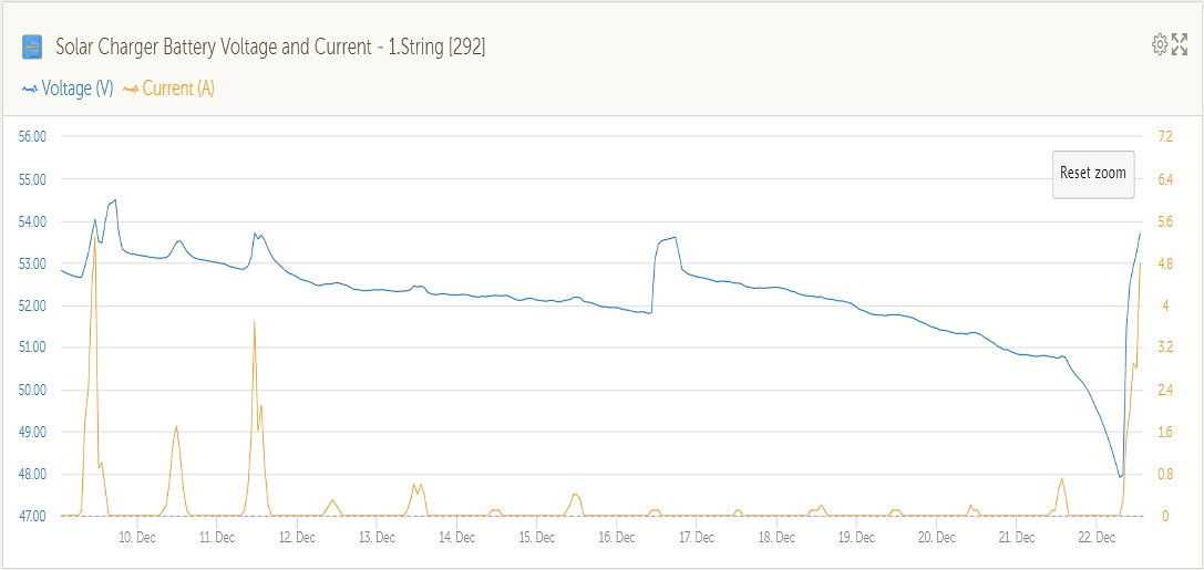 Vzhledem ke špatnému počasí, tedy vlastně k vánočnímu počasí a sněžení dostávají baterky zabrat. Dnes naštěstí vysvitlo sluníčko a díky teplotám nad nulou slezl sníh z panelů. I tak jsem byl ale nachystaný a spustil nabíjení z generátoru. Ale pro zajímavost vám ukážu, jak ta moje drobotina vypadá. Díky Victron monitoringu jsem totiž zjistil vybíjecí charakteristiku. Jestli hezkou, to si neodvažuji tvrdit, to třeba posoudí někdo z vás.
