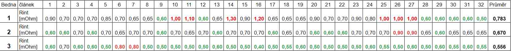 * Zvýraznil jsem ty články, které mají vnitřní odpor větší jak 1,0 mOhm u nejstarších článků. A podobně 0,9 a 0,8 mOhm.