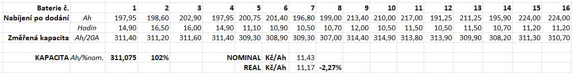 Zajímavé srovnání - možná ten inzerát ukazuje částečně odpověď na moji otázku ohledně vztahu kapacity a vnitřního odporu. Ty články jsou podle parametrů s nominálním odporem <=0,4 mOhm a kapacitou 300 Ah. Moje Winstony mají <=0,55mOhm. A ty které provozuji od roku 2012 mají horší kolem 1,0 mOhm, ten nejhorší 1,50 mOhm. Pokud bych je přesto bral jako referenci, tak při vnitřním odporu kolem 1,0 mOhm je kapacita 50-60%, při odporu 1,5 mOhm pak 45-50%. A ještě něco odebrat kvůli metodě měření kapacity, klidně 10-15%. Lineární to zcela jistě není, ale nějaká indikace snad ano. Odpor 1,0 mOhm a více znamená, že článek je zralý na výměnu. Asi tak.Foxxx píše: