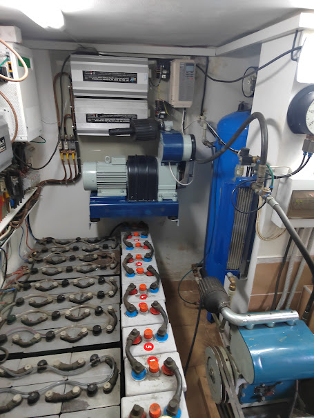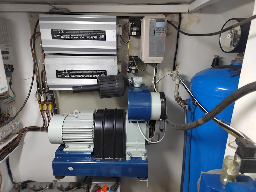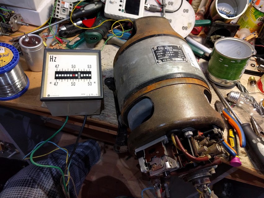 A máme tady další kus historie,krásný měnič s mizernou účinností,24V 14A na 220V 0,9A ale za to bez jediné polovodičové blbosti,možná by stálo za to tam nějak dodělat regulaci napětí a frekvence leze z toho 260V a cca 56Hz při 27V.těch 51Hz je při 23,5V ale napětí je větší než těch 220V při 38V z toho leze 690V