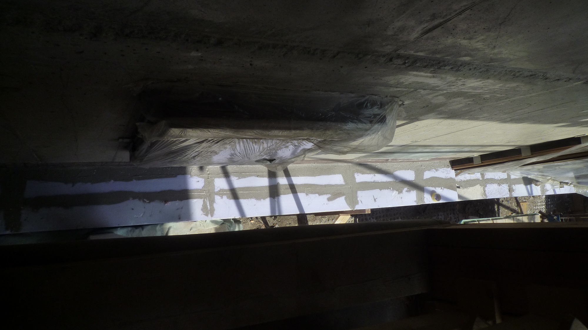 Pod bojlerem je vidět prostup s východním okruhem pro chlazení. Centrální rozdělovač, který připojuje podlahové/stropní topení a stěnové chlazení. Samozřejmě, že dneska bych to řešil ještě lépe/jinak. Ale je to ještě řešitelné, neb všechny páteřní rozvody jsou striktně taženy v šachtách s revizními dvířky a dále v místnostech po obvodu, tak že s pomocí božího stroje Hilti DCH 300 nim dostanu