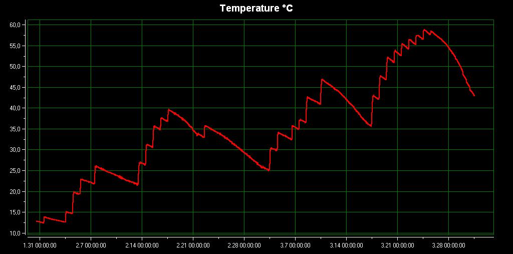 Jestli z toho něco užitečného vyčteš, tak zde je legenda: průběh teploty v AN3500l, umístěná v nevytápěném přístavku s izolací pouhých 10 cm vaty(původní síla 16 cm z minulého století se po letech poněkud slehla), na vstupu 30m2 absorbéru se solárním lakem z minulého století, krytí letitým zašedlým polykarbonátem, elevace cca 25°(optimalizace na letní bazén), azimut JJZ. V létě se z toho dá vymáčknout cca 17 kW.Ronn píše:Po instalaci invertoru a úprav/oprav viz.výše se posune nutnost topit do listopadu a končím v polovině února. Proto jsem se ptal na kalorimetr/konkrétní den a FVE přebytky/stejný den, abych si dále neblokoval rezervovaný prostor v kotelně. Má někdo taková data?