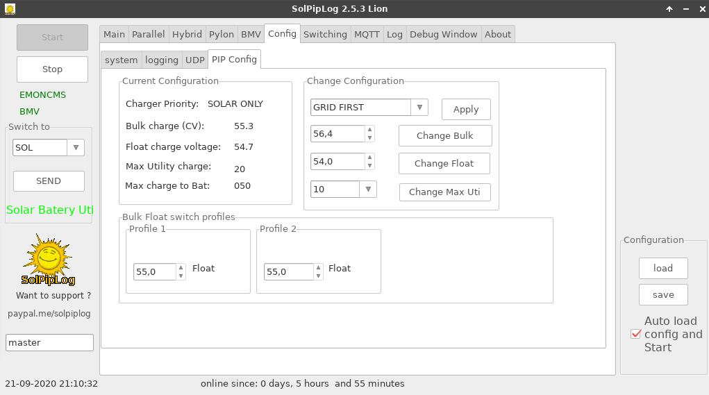 Kdo SolPipLog nezná, tak se jedná o free sw pro logování dat z voltronic měničů (Axpert, PIP,...), umí přepínat režimy nabíjení podle času nebo SoC, MQTT , umí logovat monitory stavu baterie BMV a jiné věci.