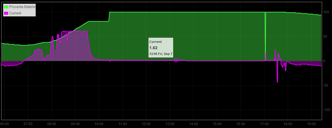 Jednu z těchto hodnot měří, druhou hodnotu dopočítává sečtením hodnot, které reportují balancery na jednotlivých článcích. Určitě tedy nastává situace o které hovoří RVA - tedy, že napětí na baterii občas vyskočí výše, než člověk nastavil. To může způsobit vykouknutí slunce z pod mraků, nebo náhlé odlehčení spotřeby. Jelikož spotřeba ten den moc nebyla, tak v mém případě asi relé zareagovalo na vzestup napětí způsobený náhlým osvitem.