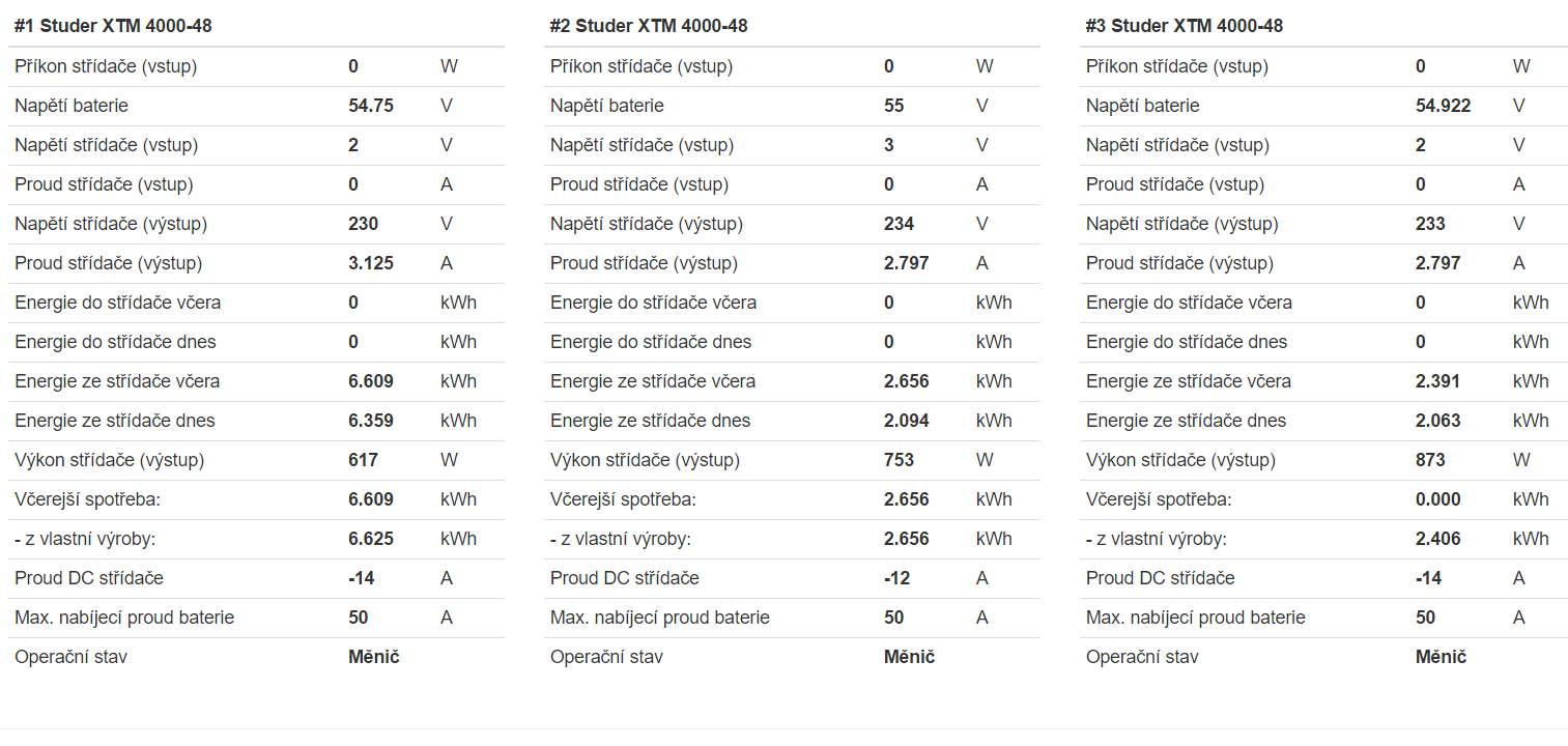 Také jsem si to myslel.Ale není to tak.Momentálně to má Studer nastaveno tak že do 2kW jede jen 1 Studer.Po překročení 2kW se připnou zbylé dva a spotřebu si rozdělí na třetiny.Nevím proč to takto mají.Lepší by bylo že pří 2 kW připne druhý a při 4 kW třetí.solarni-panely.cz píše:Parádní příklad nezávislosti v rodiném domě. Zajímavé je postupné rozšiřování systému o další měniče .. na té stěně je vidět je prostě vidět jak šel časNa odřezání drátů to toho 13.-14.3 určitě nebylo .. tzn. je super že to Xtender umí automaticky kombinovat FV se sítí - kdy v případě nedostatku sluníčka nebo při výkonové špičcce doščasně nakoupí ze sítě. 3 na sobě nezávislé toroidy navíc minimalizují odběr na prázdno tím, že se připínají jen když je potřeba a měniče tak zbytečně nežerou moc na prázdno. Předpokládám, že většinu času jede v domě jen jeden měnič a spotřeba na prázdno by tedy měla být jen cca 14W. Pokud naroste spotřeba, připne se další měnič. Ten třetí měnič je asi většinu času vypnutý a vykrývá jen superodběrové špičky, je to tak?