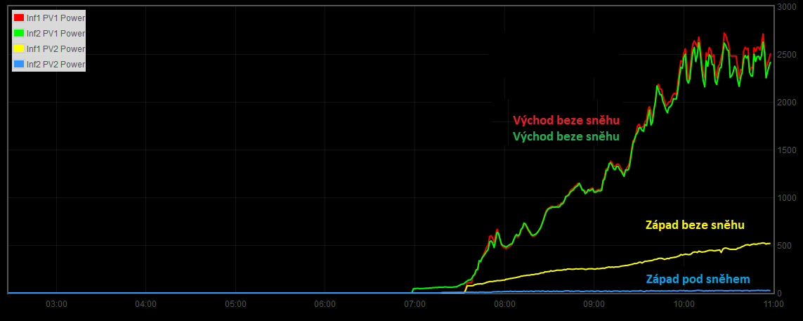 Východní stringy, sníh sám roztál jen působením slunce: Západní stringy, druhý den po hrubém ometení od sněhu: porovnání výkonů: Z mého pozorování jsem si dovolil učinit závěr, že pro střešní instalace je opravdu klíčové alespoň částečné natočení panelů k Jihu, v nejhorším případě alespoň k Východu, aby sníh mohl sám roztát. Ráno bývá často i v Zimě jasno a slunečno, odpoledne se však počasí typicky zhoršuje a západní slunce tak bývá slabší. Někdy se odpoledne zatáhne úplně.