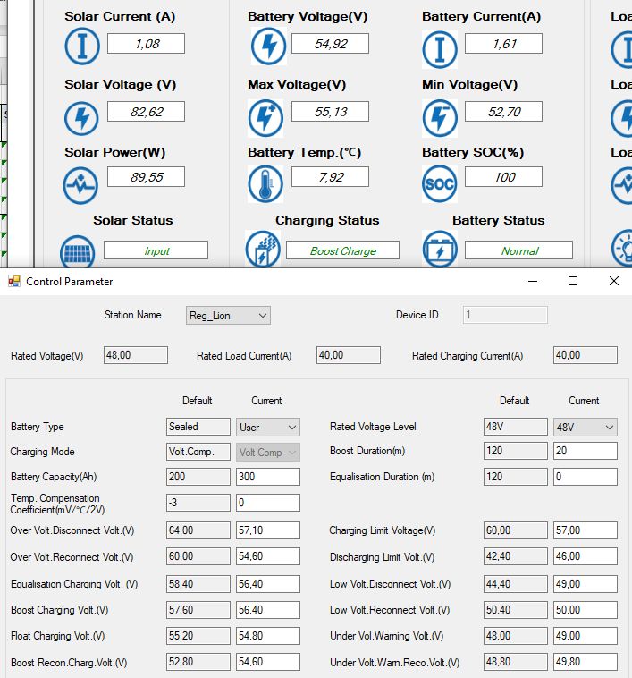 24V systém. V=1760Wp,Z= 3520Wp.J= 720Wp.Baterky Lion 600Ah celkem.Regulátor 2x6415AN+Must 80A/3000W+1x4415N na jižní stranu.Měnič victron 1200W+350W. Axpert VP 24/3000W na přebytky.Vše stále ve výstavbě.Začínám stavět 48V systém pro RD.Zatím 7,38kWp jih,Lion 900Ah.Epever 48/2000W na přebytky ,Victron 500W,Epever 5kW