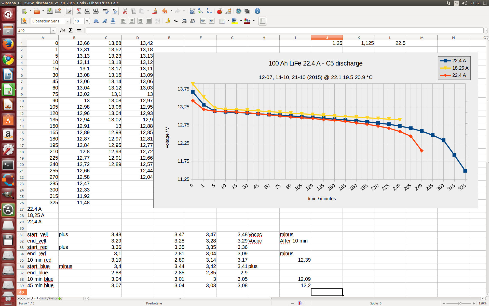 Jo, dobrý, ale 0,06 voltu je rozdíl napětí mezi 60 procent vybití a 80 procent vybití, z 3V je to 2 procenta, takže pokud je to měřeno obyč. multimetrem, může to být v podstatě jenom chyba měření, navíc ten graf je při odběru 100A a tohle bylo jenom 22A. V téhle chvíli to chtělo připojit nějakej zdroj 3,5V 20A k tomu jednomu článku a měřit dál, možná už v dalším článku bylo třeba jenom 5Ah a je škoda to řešit. Spíš bych to viděl koupit ještě jenu sadu 100Ah a pospojoval paralelně nejhořší s nejlepším, ale to už je laborace, a v průběhu času se to jistě bude měnit.