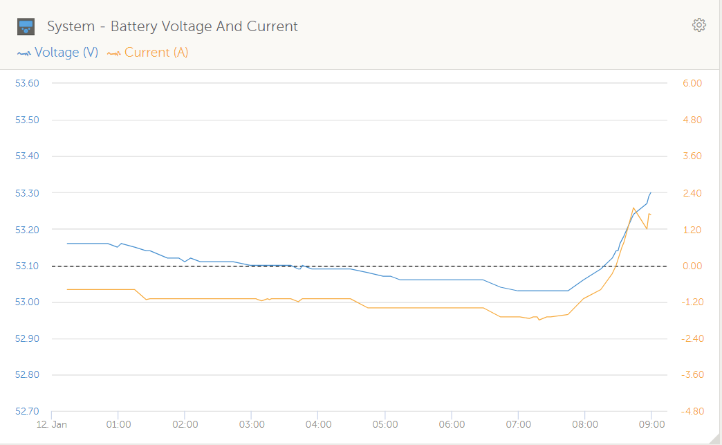Pro čtenáře, kteří neznají Victron - dobíjení přes panely je v případě neznámého měniče simulováno tím DC Power, který je v případě dobíjení -XXX W. Tohle je PrintScreen v noci a s vypnutým DC/AC měničem.