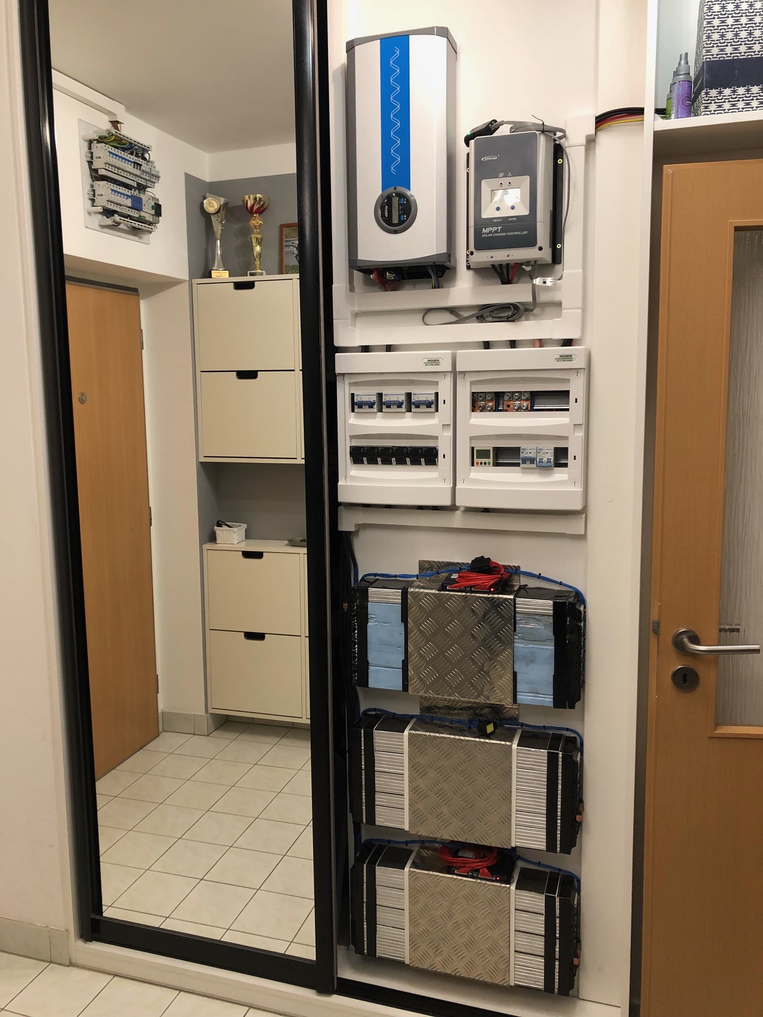 Celá FVE kromě FV panelů a k nim příslušející rozvodnice s pojistkami a přepěťovými ochranami (oboje instalováno na balkóně) je v bytě na chodbě v jedné části vestavěné skříně.
