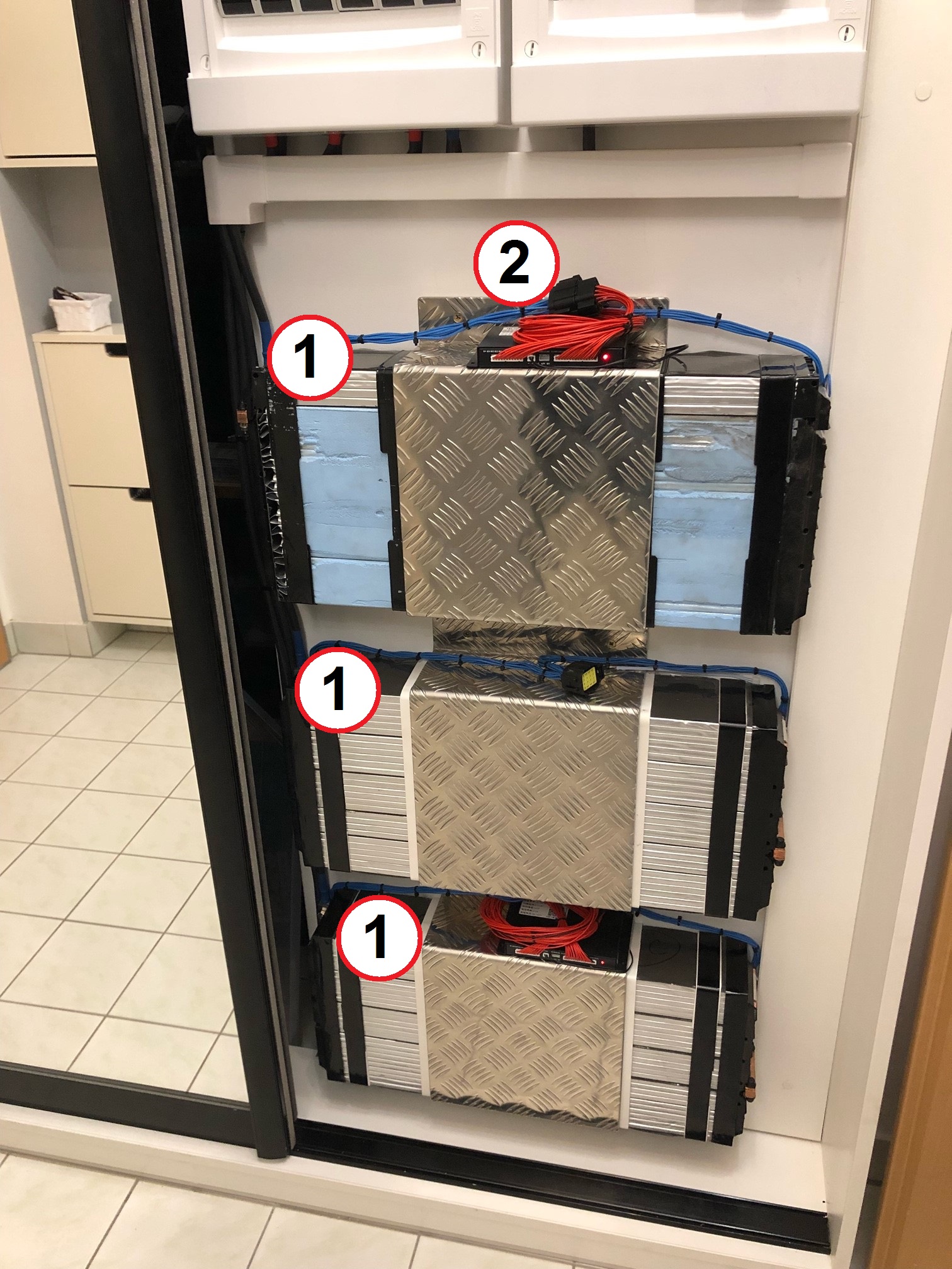 Baterie je sestavená ze 3 paralelních modulů (1). Každý modul (1) je LG Chem VW 12s2p Liion modul rozšířený na 14s2p a osazený aktivním balancerem z Ali (2).