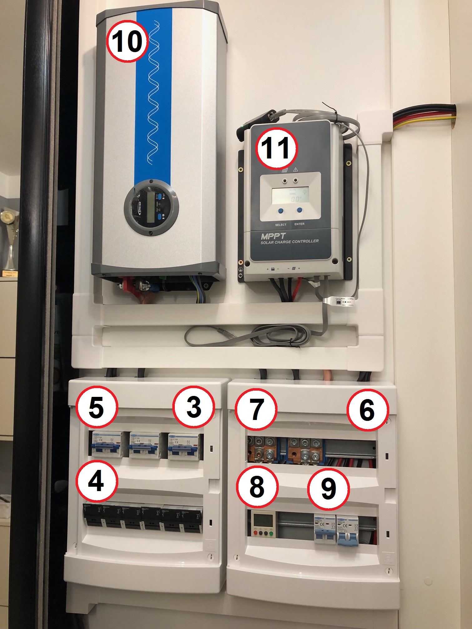 V rozvodnici (3) je každý modul jištěný dvojicí válcových pojistek přes odpínače OPVP22-1 (4) a redundantním DC jističem TOMN 100A z Ali (5). V rozvodnici (6) jsou všechny moduly elektricky spojeny na silových sběrnicích (7). Na sběrnice je přiveden i výstup ze solárního regulátoru Epever Tracer 5420AN (11). Do regulátoru je přes DC jistič TOMZN 25A z Ali (9) přivedeno napětí z FV panelů. Jističe jsou dva, protože jsem měl v plánu instalovat ještě jeden string na druhym balkóně. Programovatelný napěťový DC relé z Ali (8) snímá napětí na silových sběrnicích (7) a dle jeho hodnoty zapíná / vypíná měnič Epever IPower Plus IP5000-42 (10).