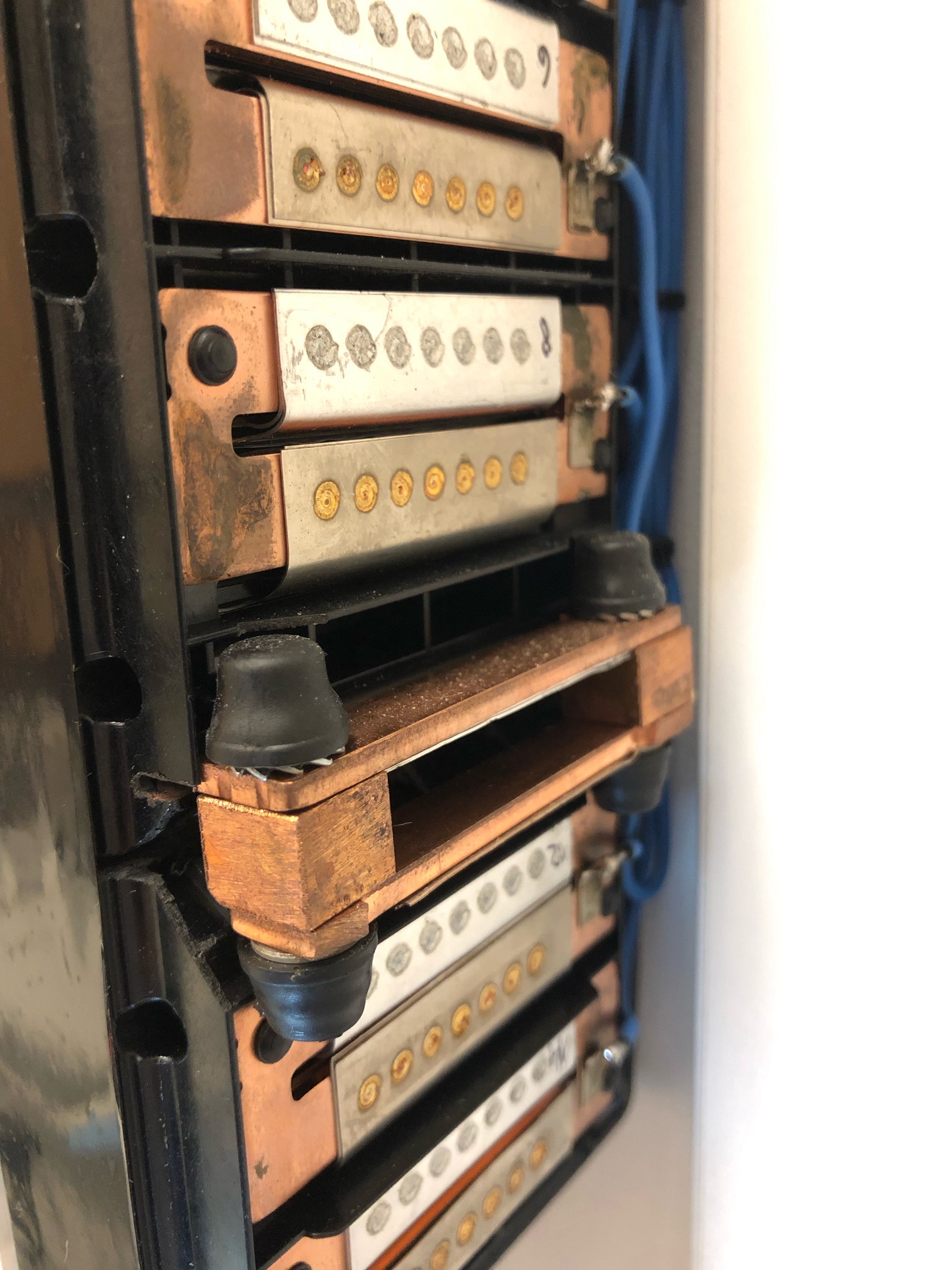 No a posledním dílem skládačky je přepínač sítí TOMZN 3P-125A z Ali (15) umístěný v hlavním bytovým rozvaděči. V něm jsou kromě původních prvků (12) ještě dva AC 3x25A jističe pro přívod z DS (13) a měniče (14). 1f přívod z měniče je na vstupu jističe (14) rozdělený na 3f. Výstupy z obou jističů jsou přivedený na příslušný vstupy přepínače sítí, který je přepnutý na automatický režim.