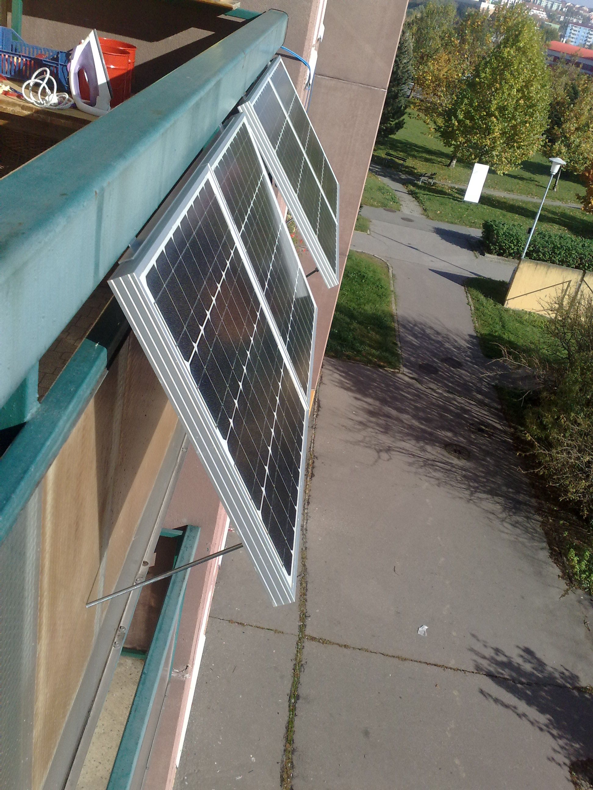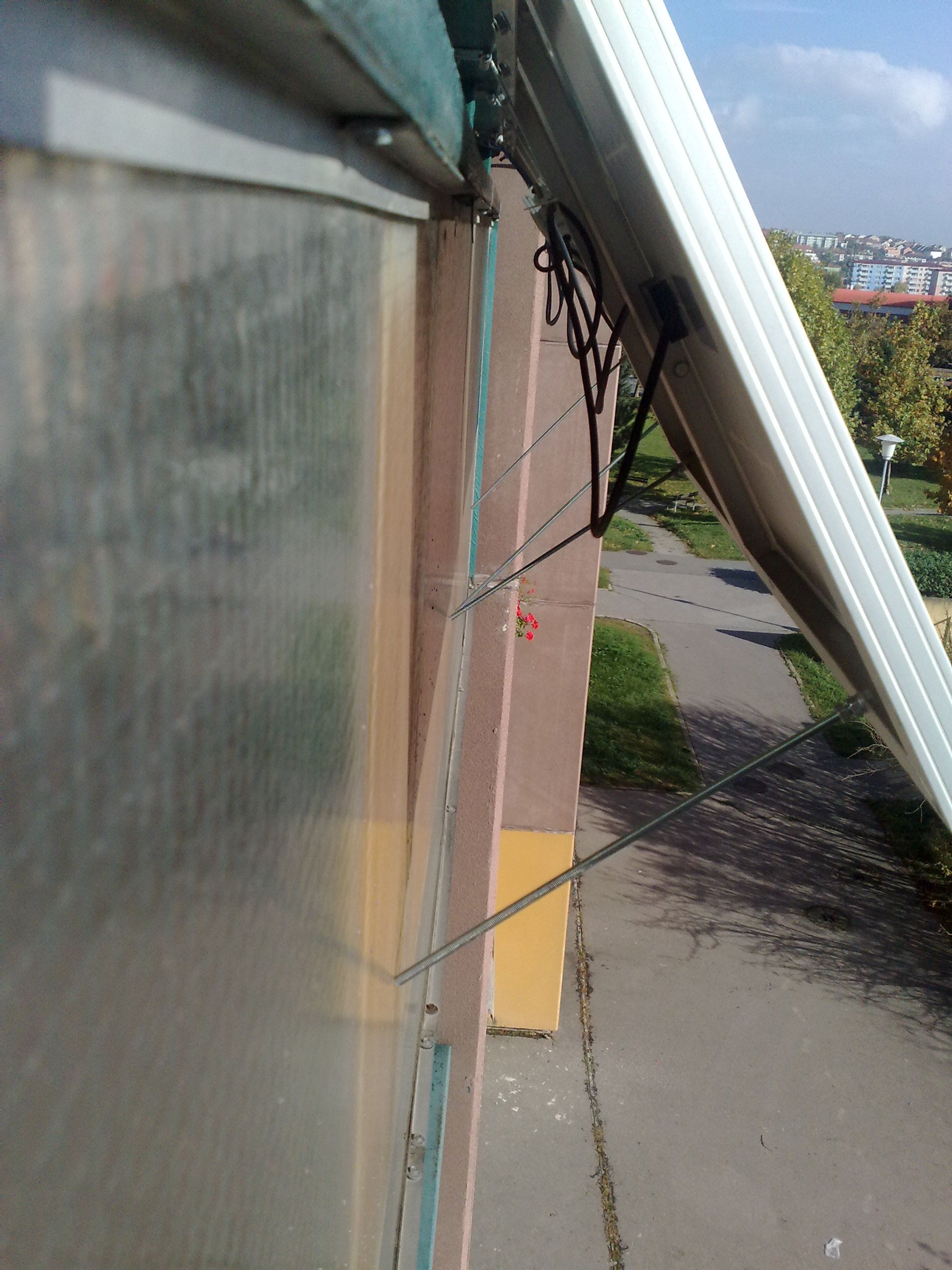 Panely jsou uchyceny na zábradlí lodžije tak, že je možno je naklánět podél vodorovné osy. Z toho důvodu jsem také vzal malé 40Wp panely, které jsou tak akorát a když se v létě skloní na úhel 45 stupňů tak zase tak moc netrčí ven. Jejich polohu, ale měním jen podle ročního období, takže má tři polohy: zima, jaro/podzim a léto. Ve spolupráci s MPPT regulátorem by toto nastavení mělo snad zajistit nejefektivnější zisky energie po celý rok.