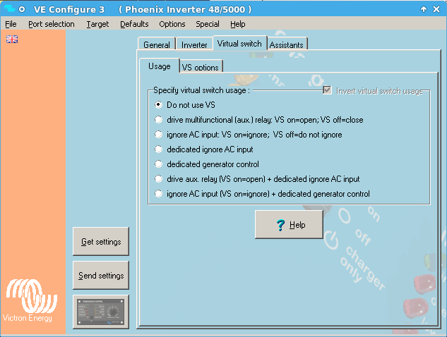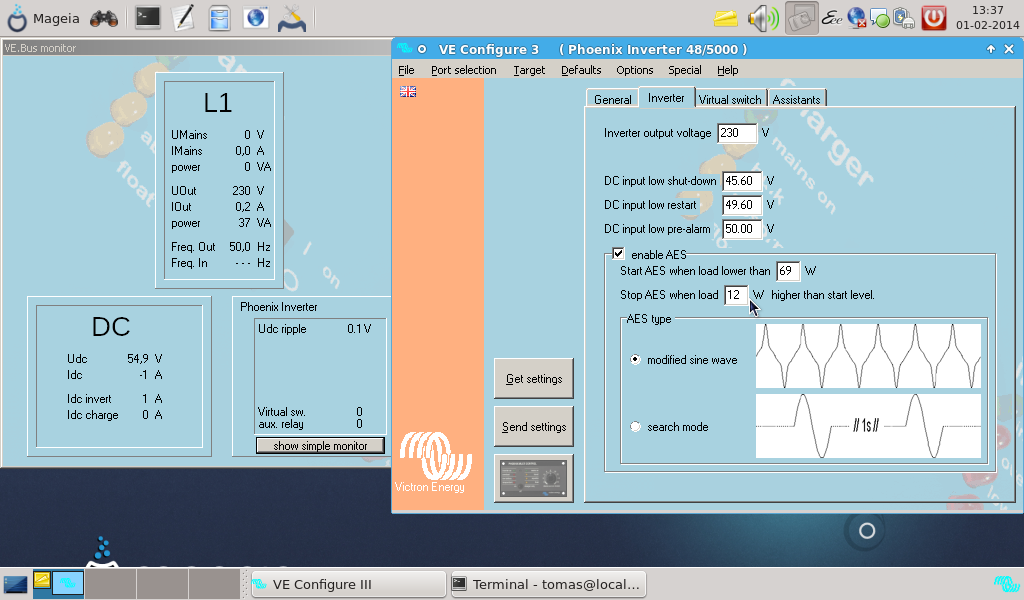 Měnič Victron Energy Phoenix má pro nastavení software, které je s pomocí komunikačního rozhraní MK2.2b serial a převodníku serial-USB v Linuxu ve WINE plně funkční.