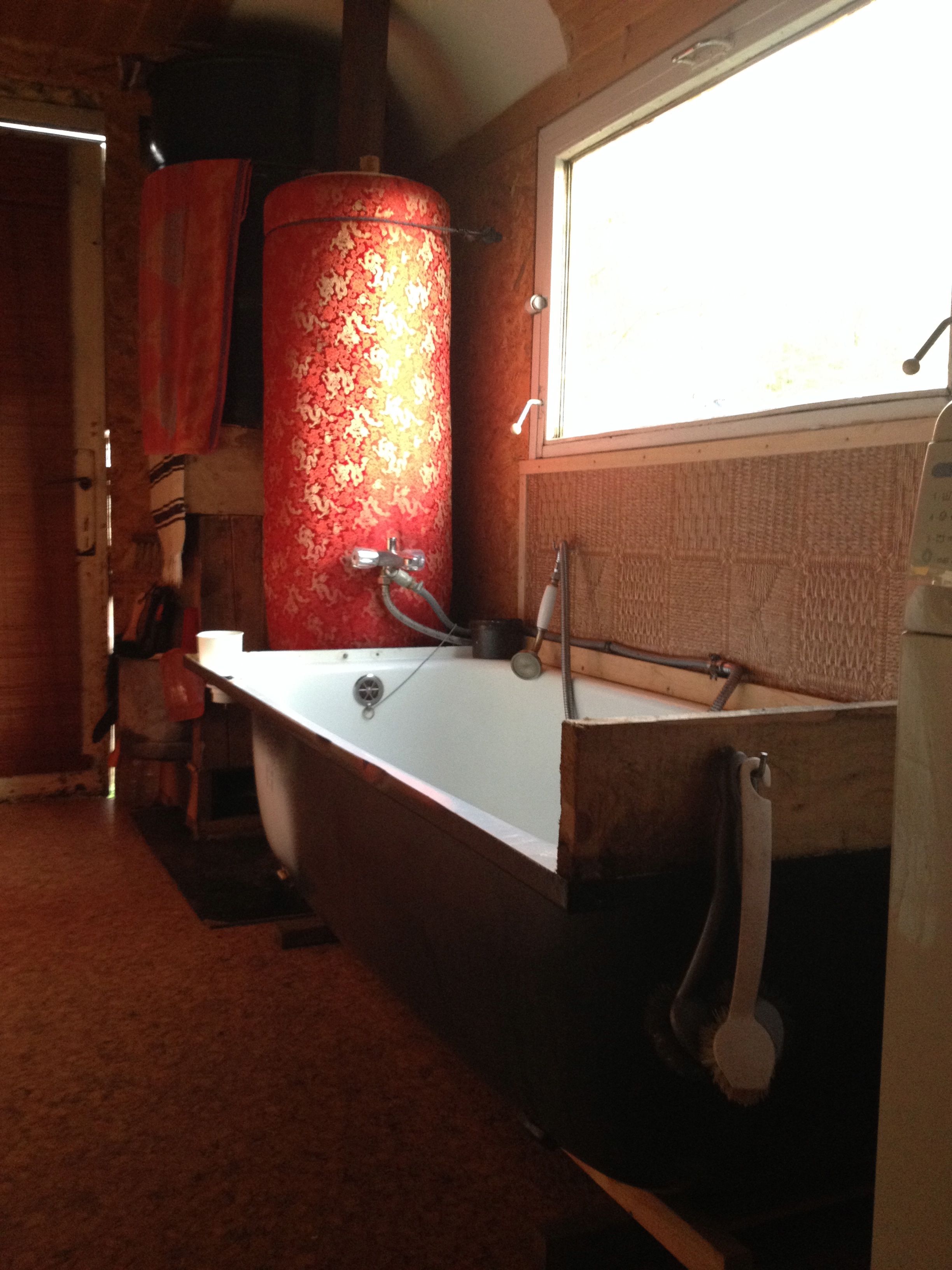 Teplou vodu vyrábíme v lázeňských kamnech obalených izolací. 100 litrový zásobník udrží vodu teplou po 48 hodin při poklesu teploty z 80 na 60 stupňů. Na ohřátí 100 litů teplé vody na 85 stupňů spotřebujeme 4 brikety RUF o váze kusu 1kg. Celková cena 100 litrů teplé vody z 10 na 85 stupňů je 20 kč... pokud nasbírám 4 kg tvrdého dřeva je to zadara úplně. Pominu li čerpání vody to něco málo stojí.