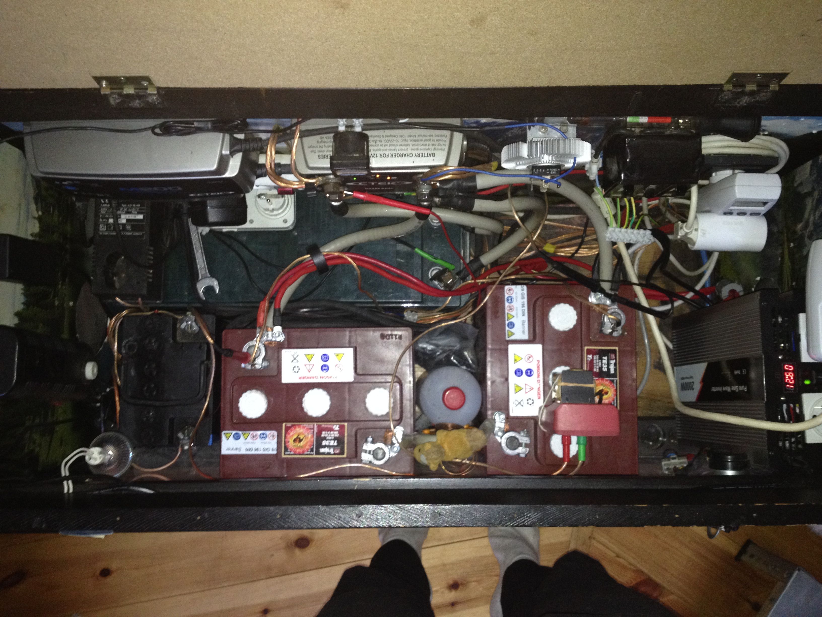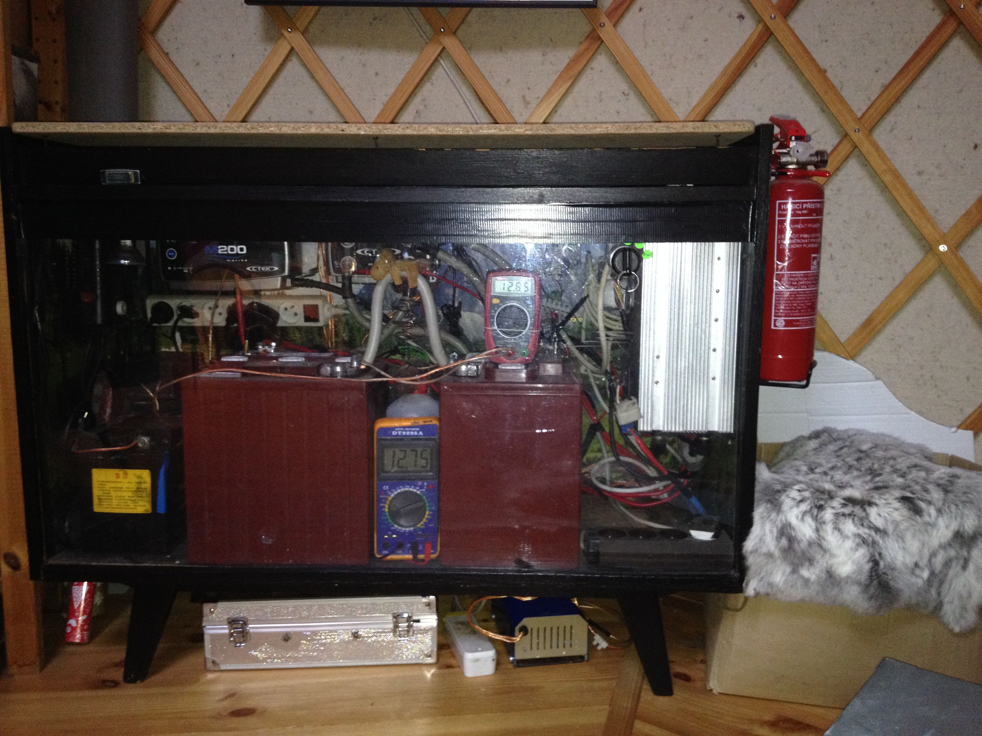 Zkoušeli jsme si nasimulovat co by se stalo při vypuknutí požáru v jurtě. Výsledek je tak napůl. Evakuace osob do bezpečné vzdálenosti zabrala cca 30 vteřin to bylo dobré. To horší bylo zjištění, že jurta by shořela napadrť. Ale věci vem čert, zdraví je důležitější. Případnou explozi baterií by měla skříň z velké části zachytit, navíc v noci když spíme je celý systém deaktivován a šance, že baterie vyletí do luftu když spíme se tím minimalizuje. Přetížení baterií může nastat v podstatě jen tehdy, když by něco zkratovalo výstupní svorky tím, že by na ně něco spadlo. Tož je při zavřeném víku téměř nerealizovatelné i díky poloze baterií. Jinak celý systém obsahuje všechny myslitelné ochrany, akorát nejsou vidět protože jsou povětšinou ukryty v přístrojích. Jednotlivé silové VN okruhy jsou jištěny přes jističe a centrála má navíc proudový chránič. Proudový chránič je i v rozvodu pro čerpadlo.