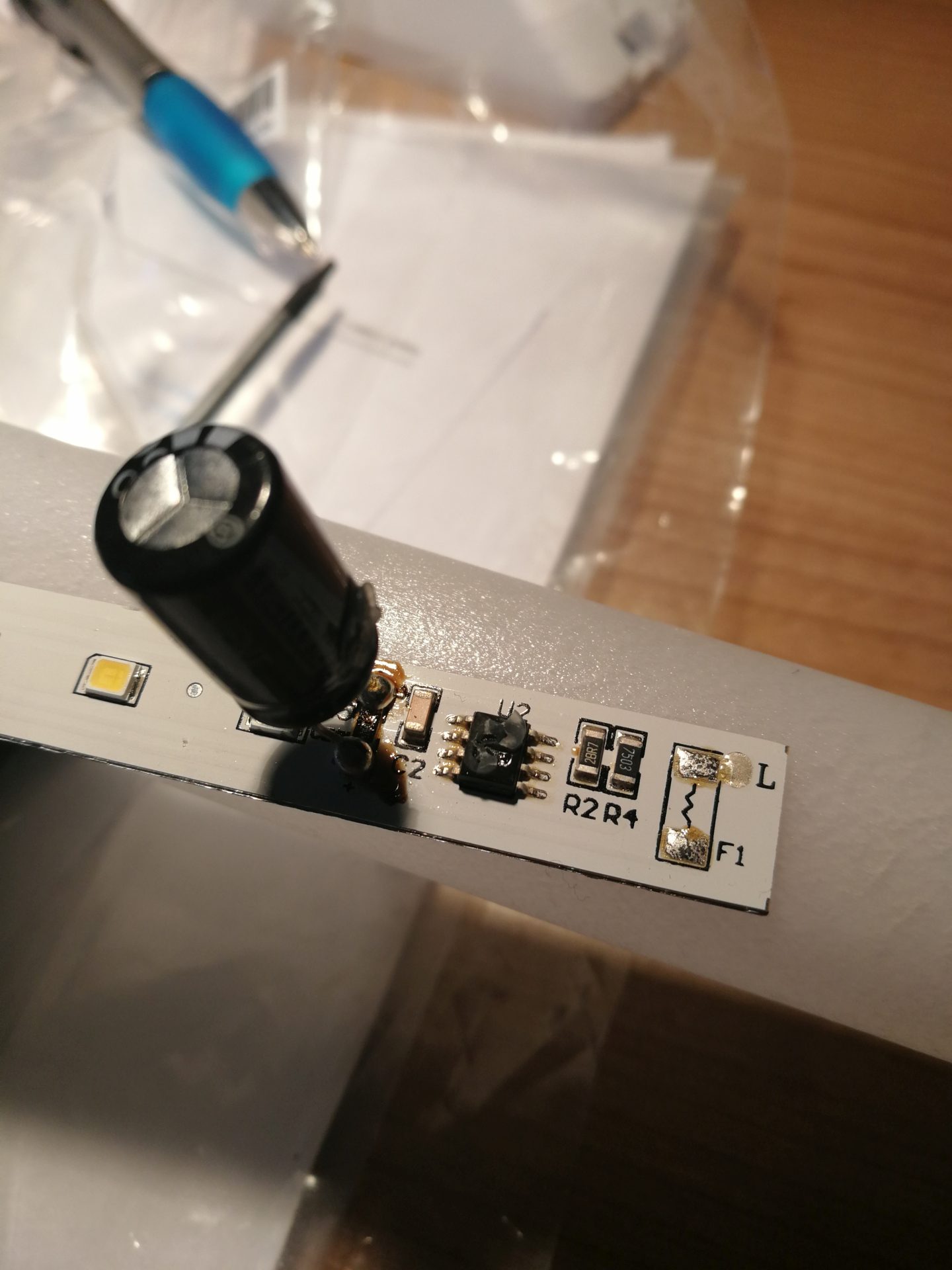 Obvykle to bývá LED chip https://www.aliexpress.com/item/2026318281.html - stačí změřit rozměr a je jasné, co objednat. Obvykle to je ten, který nesvítí ani slabě. Multimetrem se na něm naměří napětí zdroje - ale tady pozor, někdy to mají tak ošizené, že tam může pronikat i to síťové. Špatně se vypájí, protože teplo od pájky je odváděno pryč. Takže na to používám klempířské kopyto 500W přiložené ze zhora na čip. A při pájení nového samozřejmě záleží na orientaci - je to dioda.