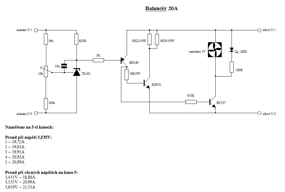 Je to tak, kupoval jsem chladiče, výkonové odpory a ventilátory. Ano při 4V jsou překročeny proudy na TL431 vím o tom, u mne by už jiné systémy dávno odpojily (při 3,65V/čl) AKU kompletně od všeho. Pokud by napětí takto narostlo je to asi fest průšvih u každého kdo má LiFePo na které je to konstruováno. Ale je to vlastnost o které je dobré vědět.kodl69 píše:je mi jasný, že to vzniklo metodou co dům dal, KD501 už jenom ve výprodeji, ale TL431 nemá nijak omezený proud, kdyby náhodou napětí překročilo 4V, tak buď shoří nebo přestane regulovat.