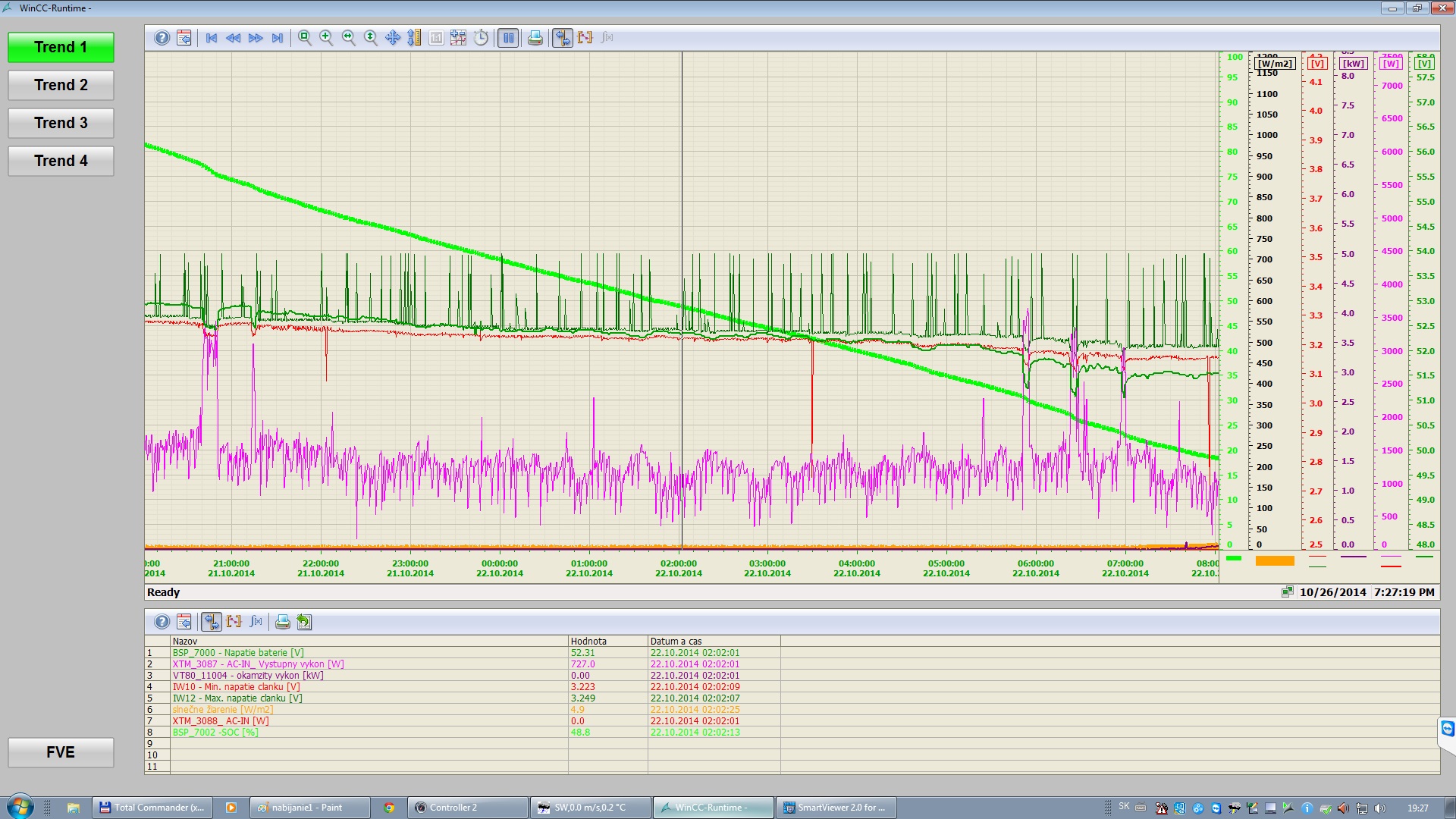 Přidávám graf z dnešní noci a dopoledne. 6 článků super srovnáno ale ten 7. V noci byly články dobity ze sítě a ten 7. vadný navíc podpořen nabíječkou. Vzhledem k dobrému dobíjení ze slunce, ale i občasným záběrem pračky, myčky a kávovaru (je u nás na návštěvě švagrová) dostává právě ten 7. článek pěkně zabrat!!
