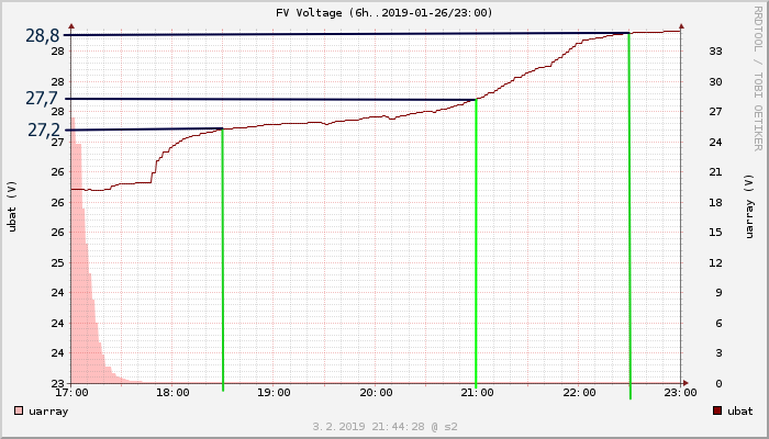 - vzhledem k postupnému růstu napětí = nelze tedy tak úplně předpokládat, že takováto charakteristika (celkové napětí/čas) je stabilní jev. Charakteristika se bude měnit podle stavu článků i v této závěrečné fázi nabíjení = může být množina článků, které i v této fázi nejsou úplně dobité. Příště prověřím reálné napětí na jednotlivých článcích, abych ověřil, že jsou v tomto stavu opravdu všechny. Na druhou stranu lze asi konstatovat, že kdykoliv v této fázi ukončím nabíjení, už do baterek v podstatě nic nedostanu. Pokud tam není nějaký opravdu "vadný" článek. Teď k tomu asi bude příležitost - mám na panelech 10 cm sněhu ;)