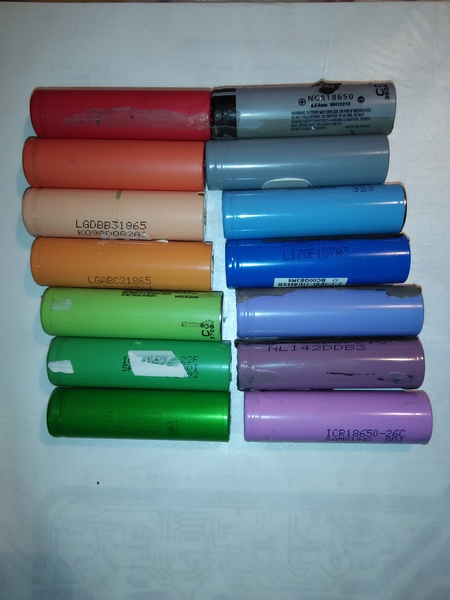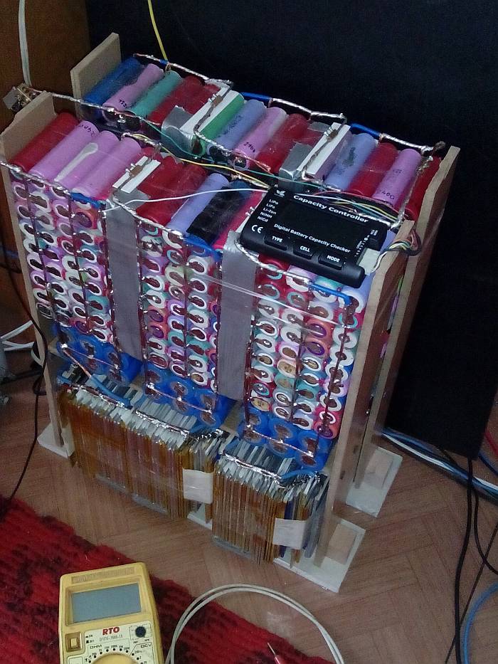 Pak li-ion 22V a cca 175 A/h (3,8 kW/h odmeranych, pouzitelnych). 18650 kazdu otestoval, (ala volente) odpadu bolo asi 20% (z toho odpadu sa dalo asi 5% pouzit s nizkou kapacitou inde). Prizmy len voltmetricky premeral (3ks na vyhodenie).