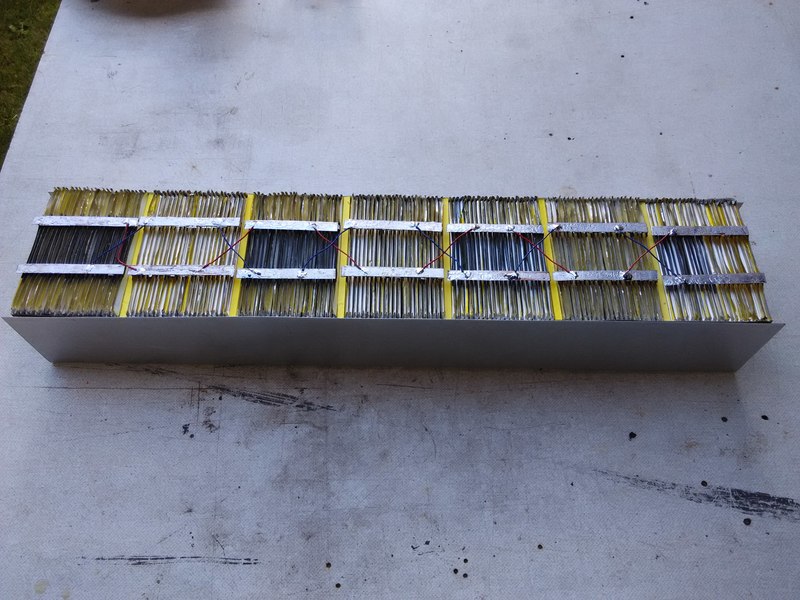 U každého článku jsem vyhodil elektroniku nechal tam jen vratnou pojistku a každá článek pomocí nabíječky iCharger 1010B+ a měřáku YR1030 překontroloval a postupně jsem je spojil do bloků . Spojené jsou pomocí široké sběrnice používané v sol. panelech . a pak třema vývodama propojovány seriově .