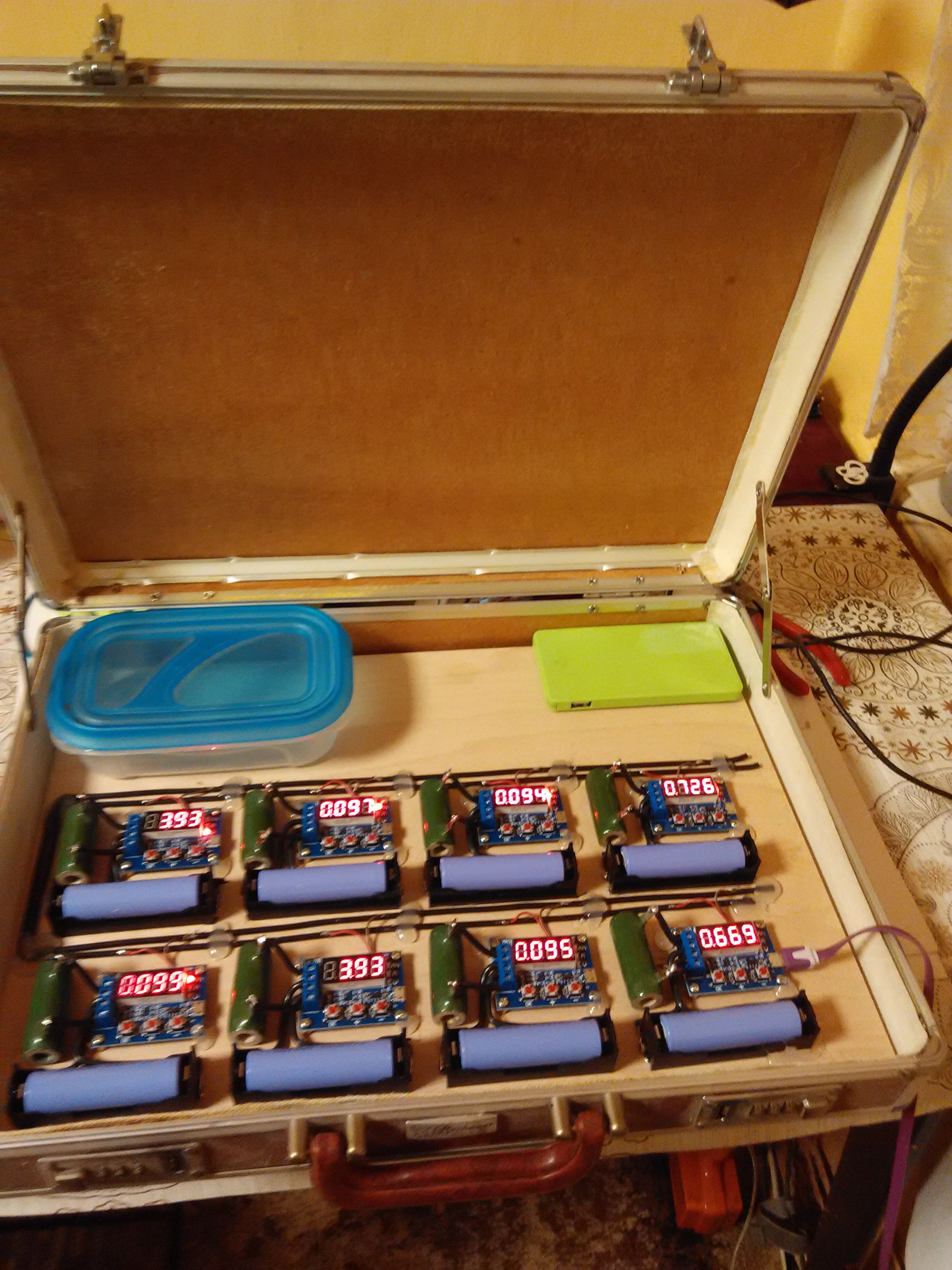 Protože potřebuji občas změřit kapacitu více kusů (asi 1000) článků 18650, což vyžadovalo hodně času, rozhodl jsem se postavit přenosné měřící centrum na 8ks článků pro kontiunální celodenní průběh měření. Napájení obstarává nabíječka na smartfone a v případě cesty do a z práce powerbanka. Tuto když jsem testoval na 1 až 3 kusech modulů odmítala spolupracovat a po chvilce se vypínala. S 8 moduly už pracuje bezchybně. Asi potřebuje větší odběr.